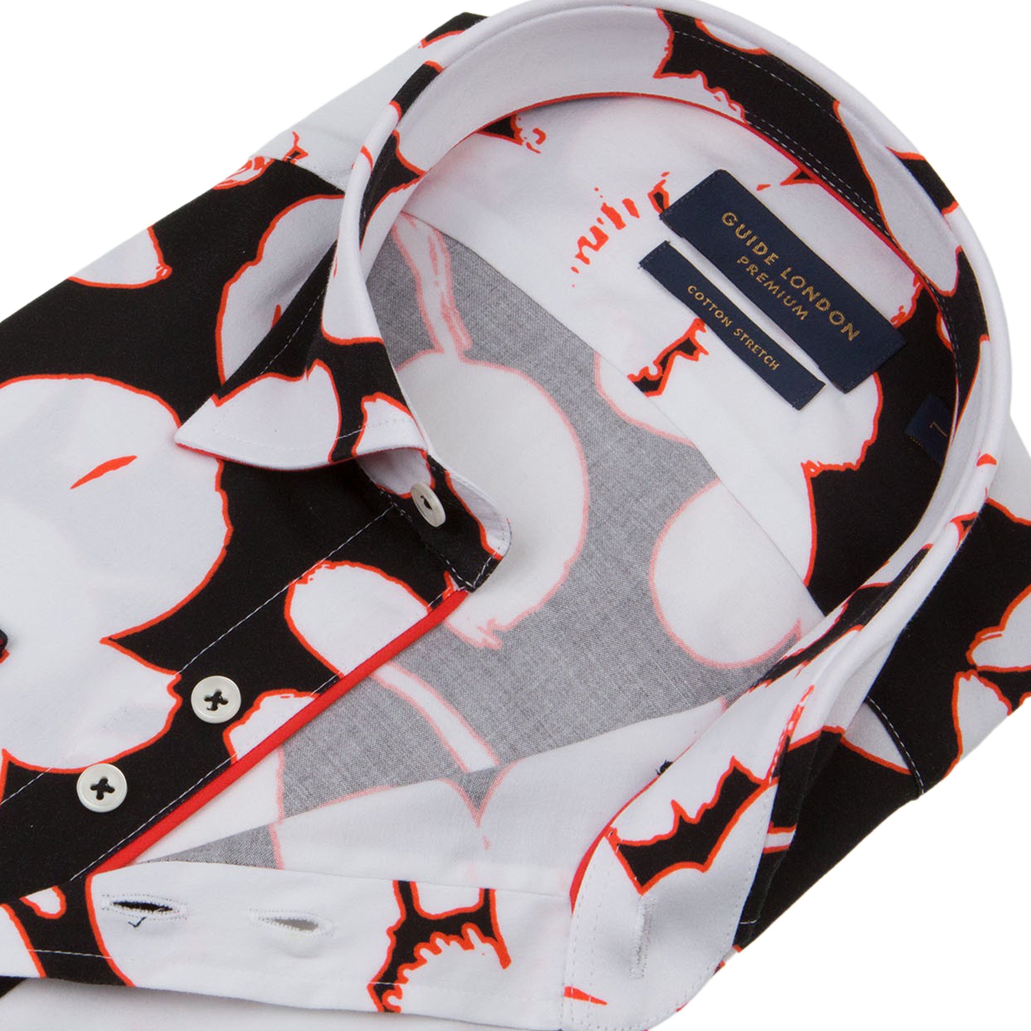 An abstract floral design printed on our luxurious stretch cotton sateen ground. The white print and red outline are striking against the black background. Interior contrast details in red complement the red in the print. Not for shrinking wallflowers.