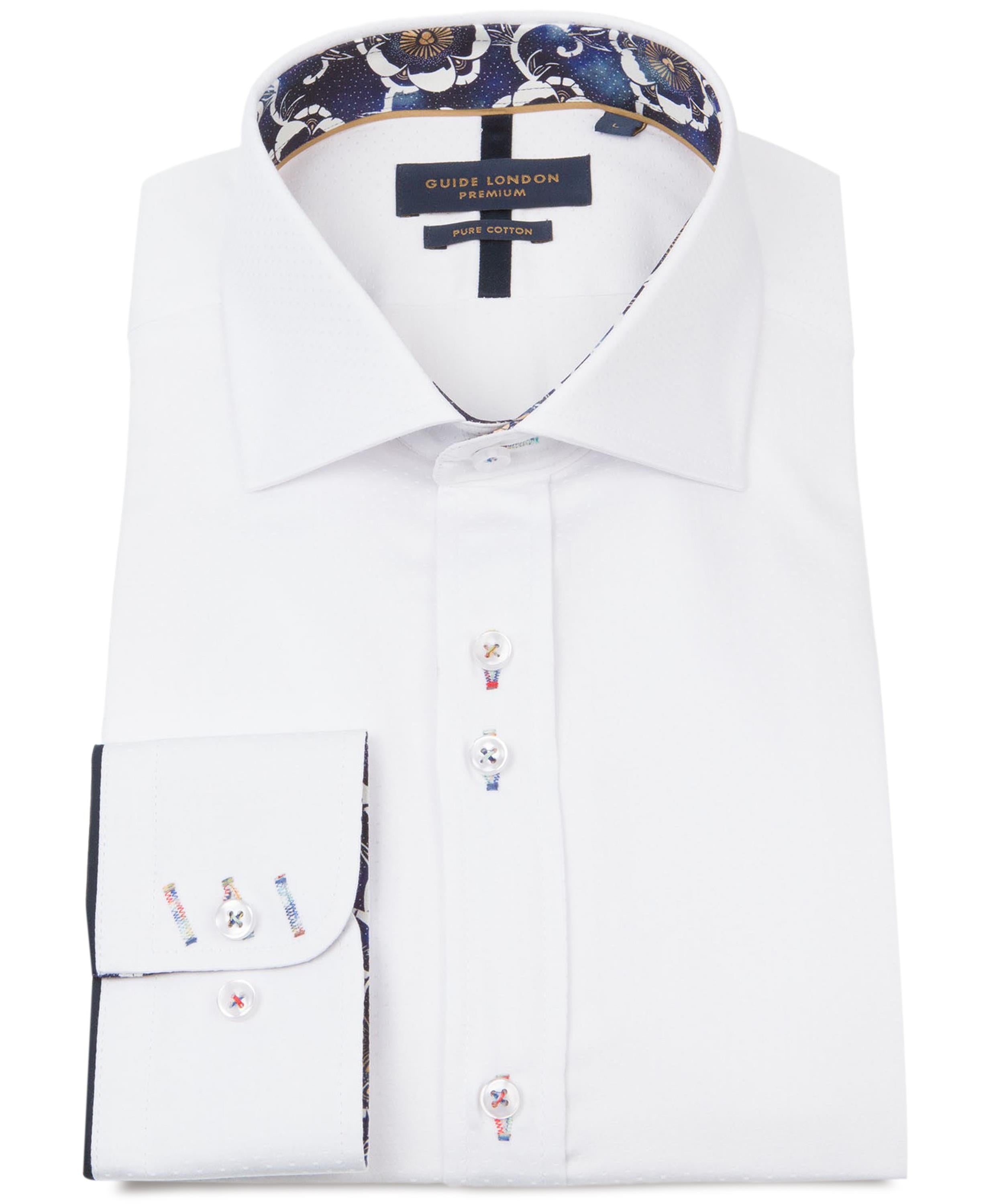 A signature Guide London fabric - the tonal textured dots on this shirt offer that little bit of shimmer, and the touch is soft and smooth to boot! Bolder details on the outside really give this shirt a lift - check out the contrast buttonholes and trim at the top edge of the cuffs.