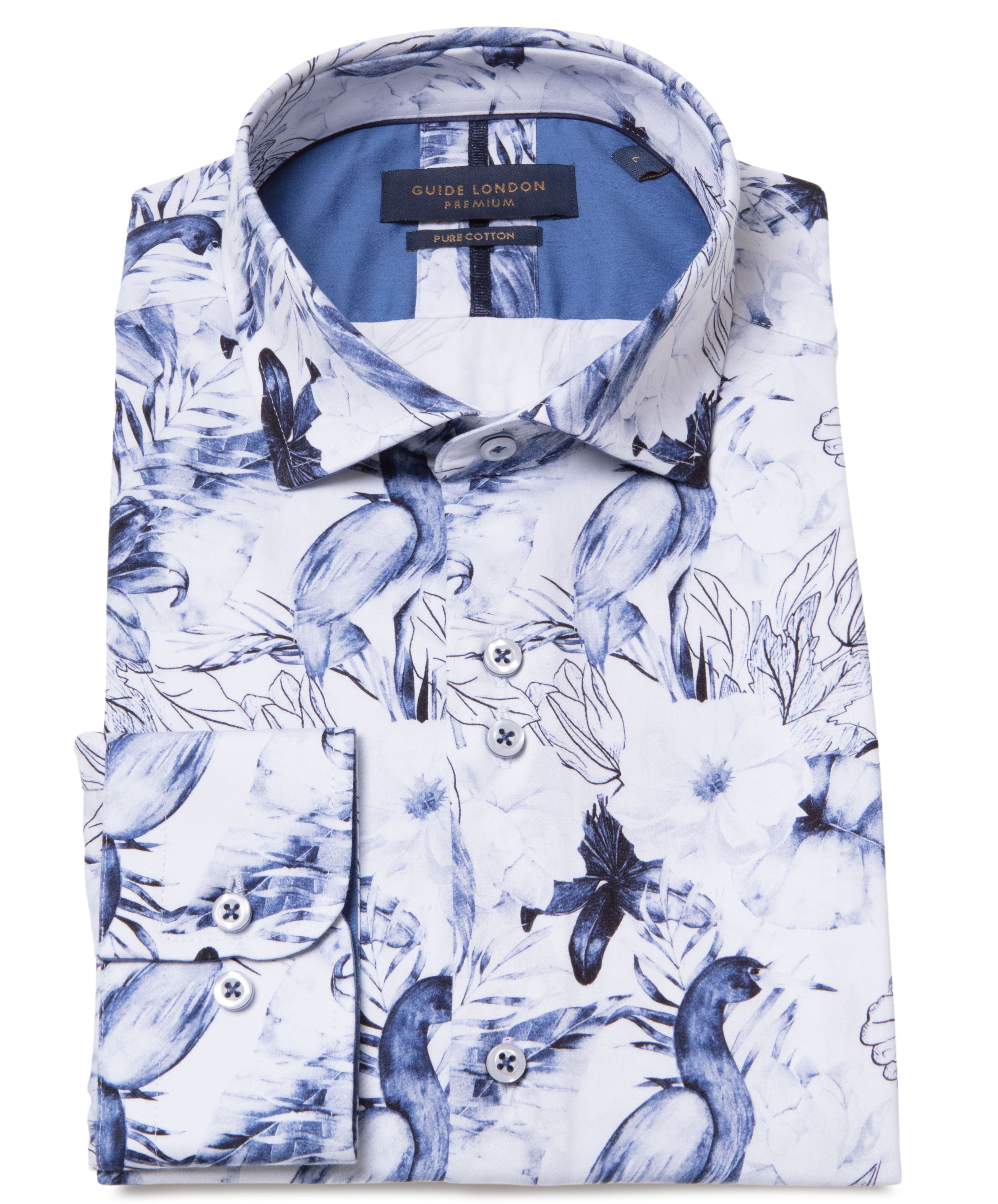 Embrace a touch of nature with our 100% cotton long sleeve shirt, featuring a delicate stencil design of birds and flowers in soothing shades of blue on a crisp white background. This elegant pattern brings a fresh, serene vibe to your wardrobe, making it an ideal choice for both casual and semi-formal occasions. Crafted from soft, breathable cotton, this shirt offers all-day comfort while showcasing a unique, artistic flair.