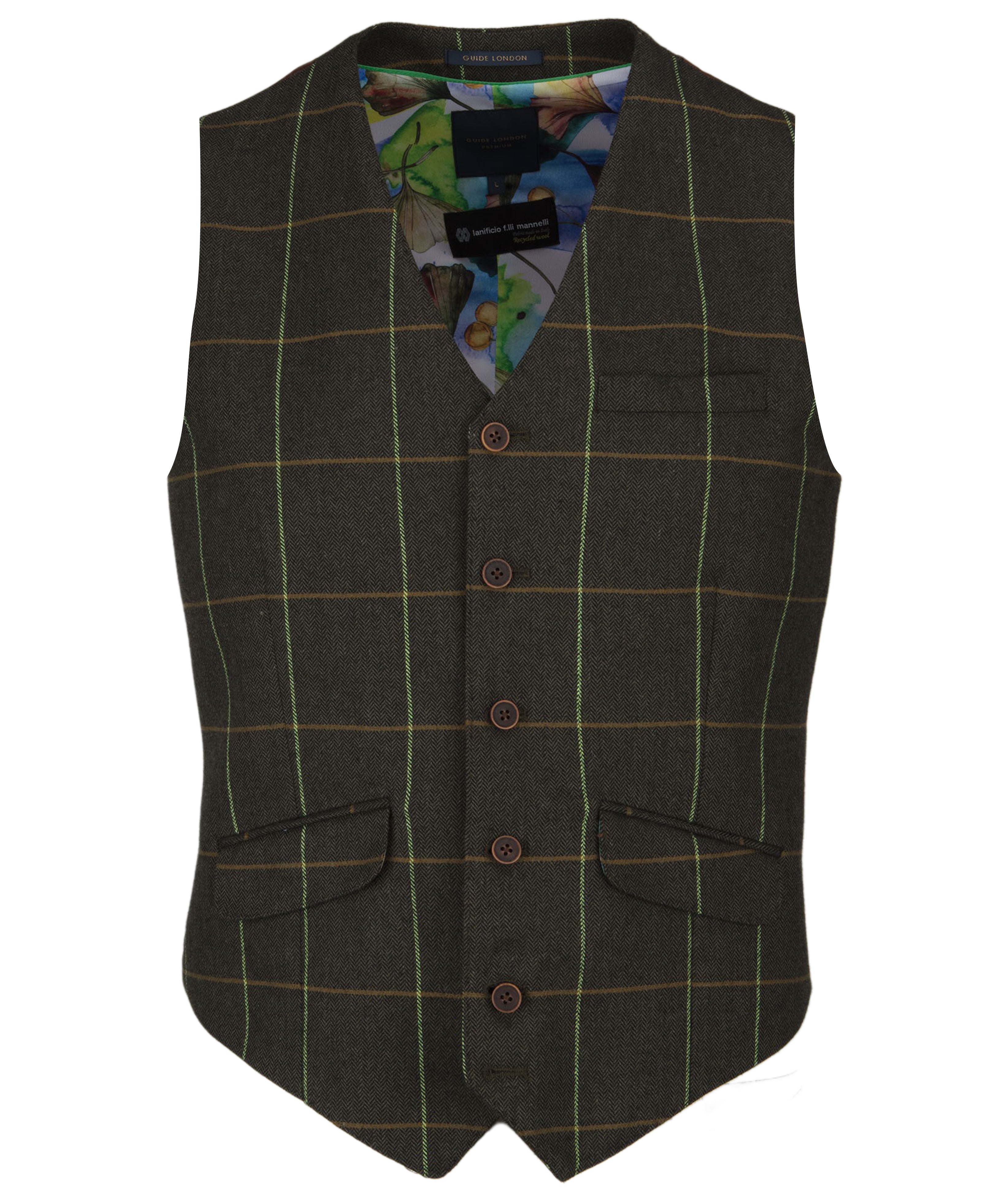 Add some 'checks appeal' into your suit collection with this checked Khaki suit waistcoat. Crafted in a Wool and Cotton blend with a bright Green and Tan check, it features a welt pocket at the chest and flap pockets at the waist. The stunning leaf print lining really brings the waistcoat to life. Matching blazer, trouser and shirt are available for the total look.