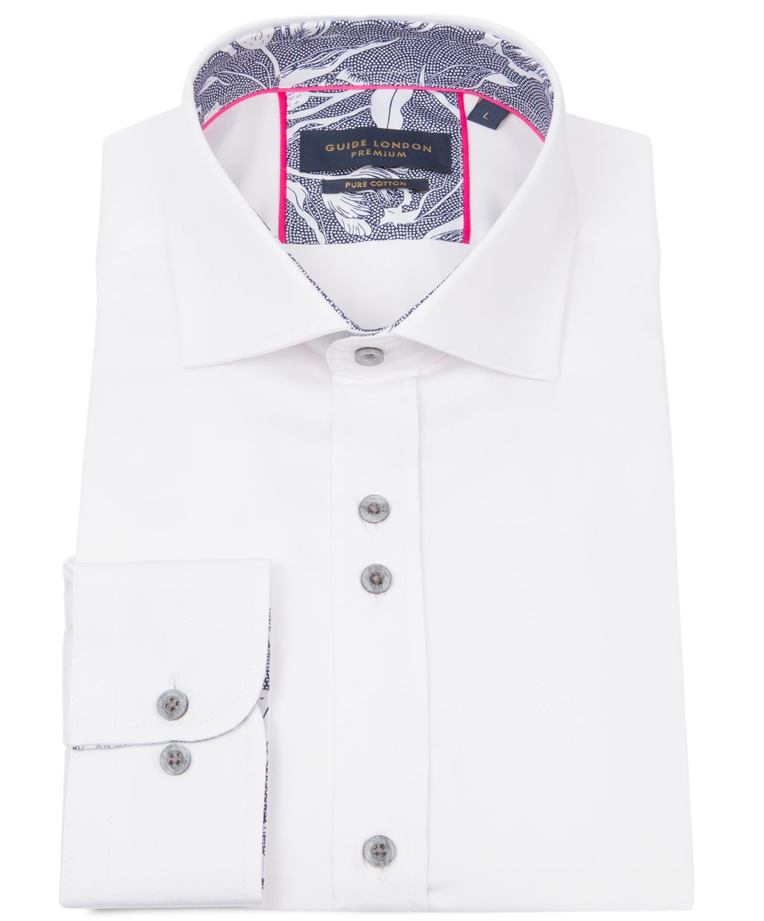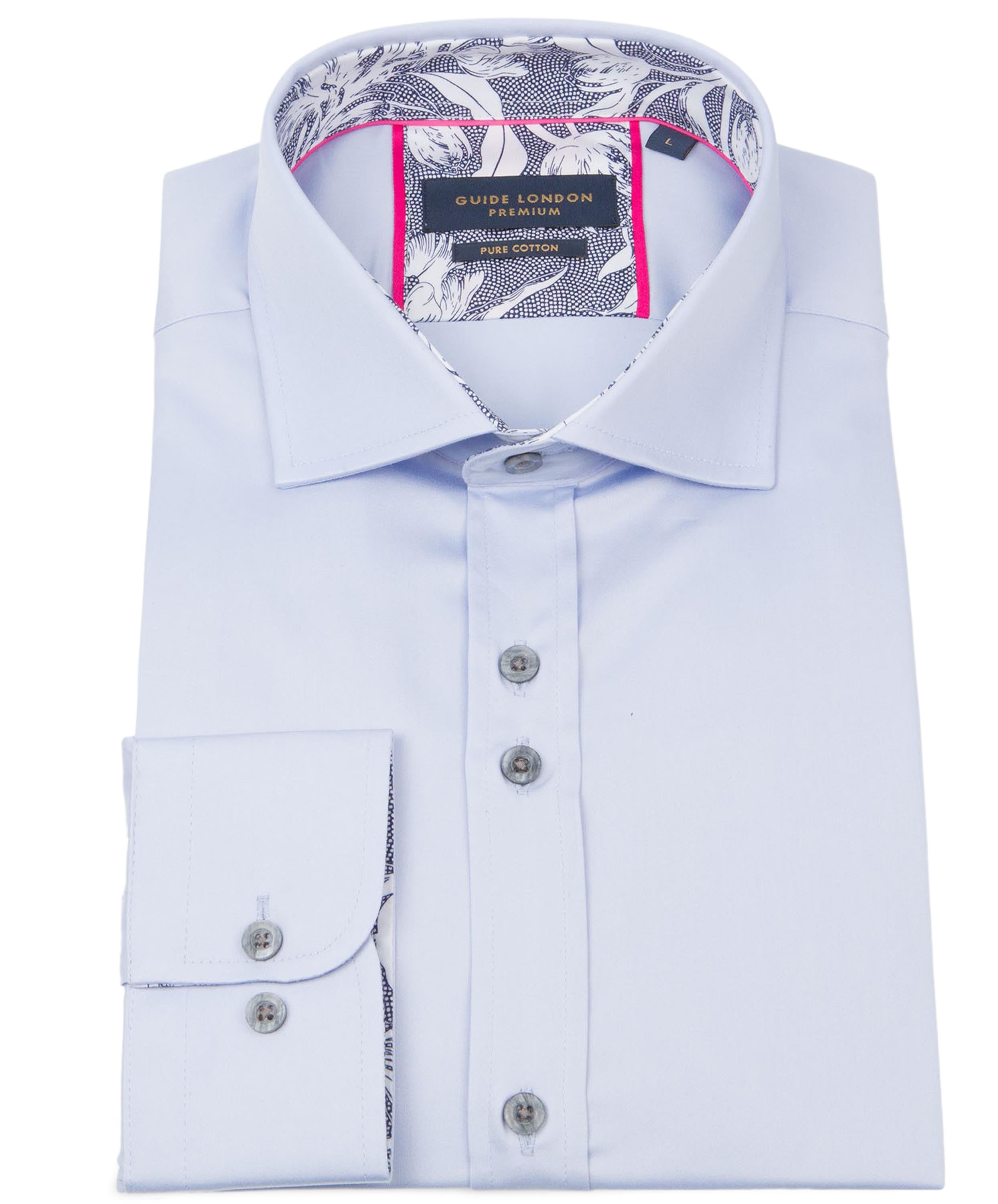 A Guide take on a plain shirt, this style is crafted in our luxurious pure cotton sateen and features a pearlised button and interior details in a soft floral contrast. Finished with golden yellow and cornflower blue piping detail, this is a must-have for every man's wardrobe.