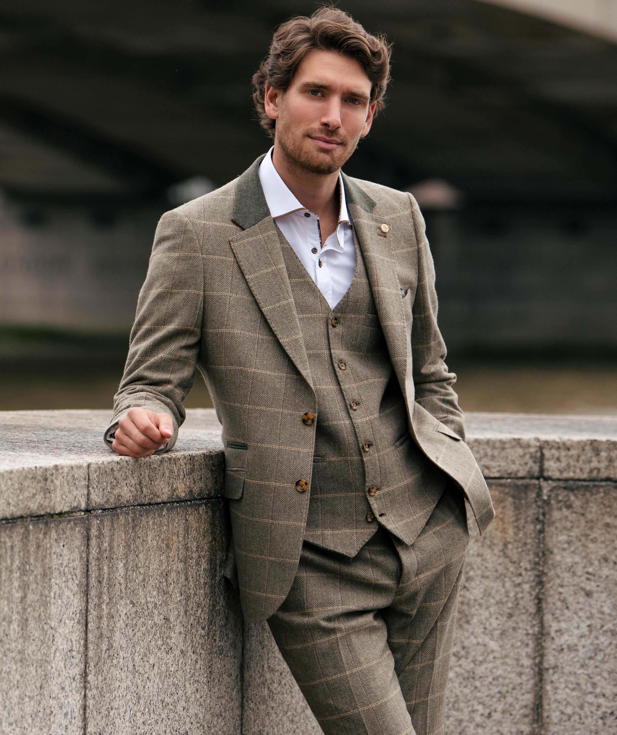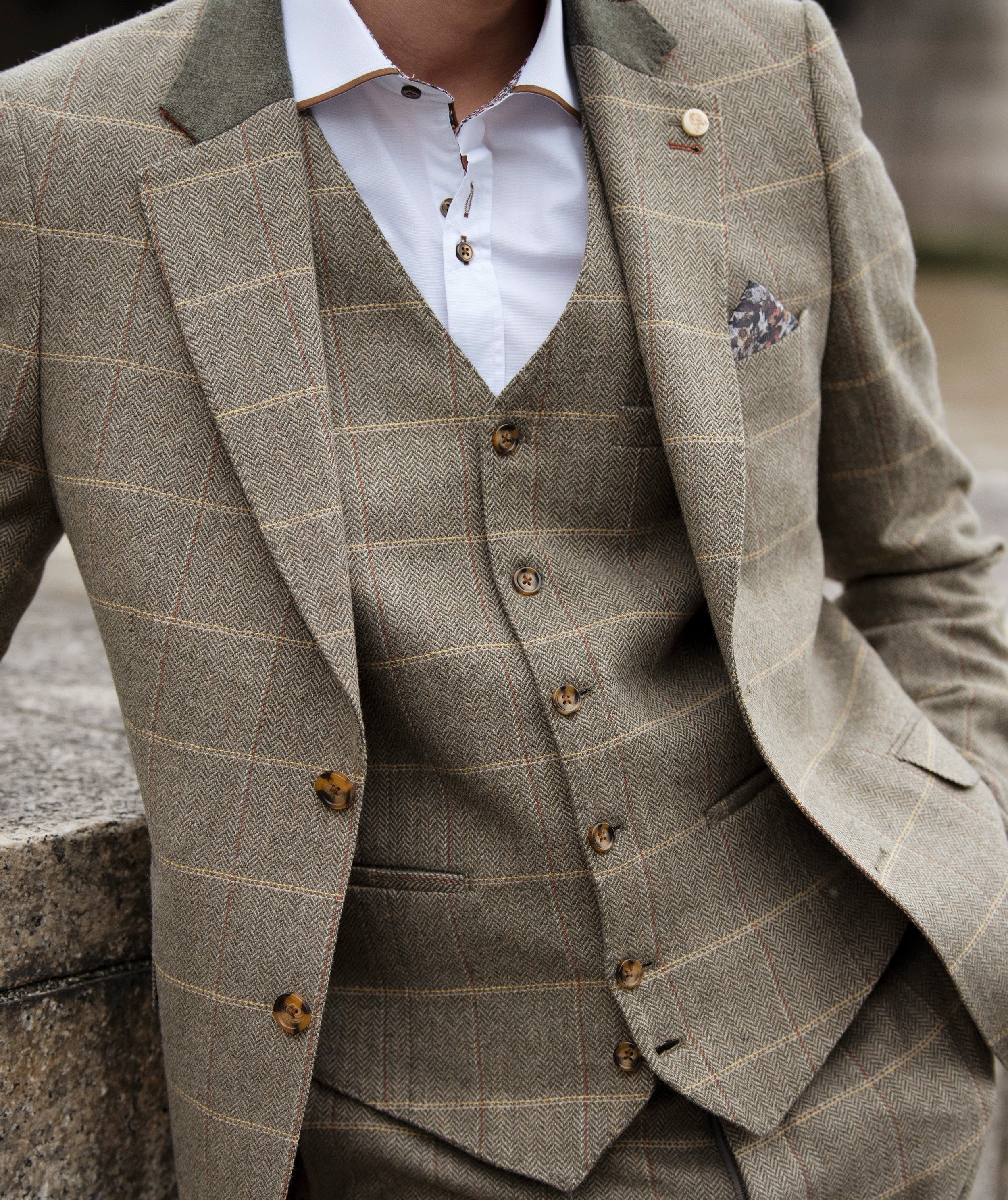 Complete your ensemble with our Men's Green Herringbone Check Waistcoat, designed to perfectly complement the matching jacket or to stand out on its own. Crafted from premium fabric, this waistcoat showcases a refined green herringbone pattern with subtle check detailing, offering a classic yet contemporary look. With its tailored fit, it provides a sleek, structured silhouette that enhances both formal and smart-casual outfits. Ideal for layering over shirts, this versatile waistcoat adds a polished touch to any occasion, ensuring you look sharp and sophisticated with effortless style.