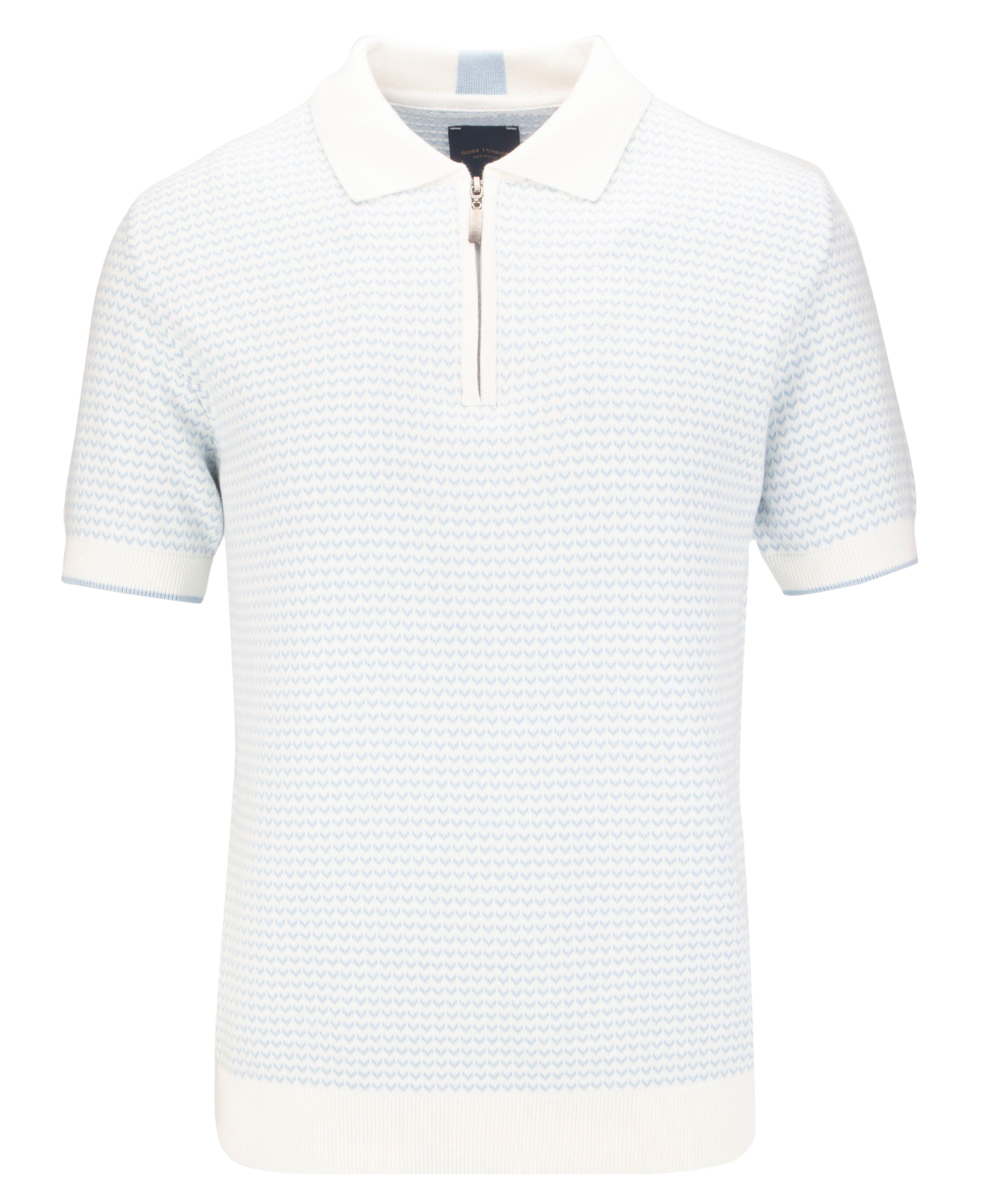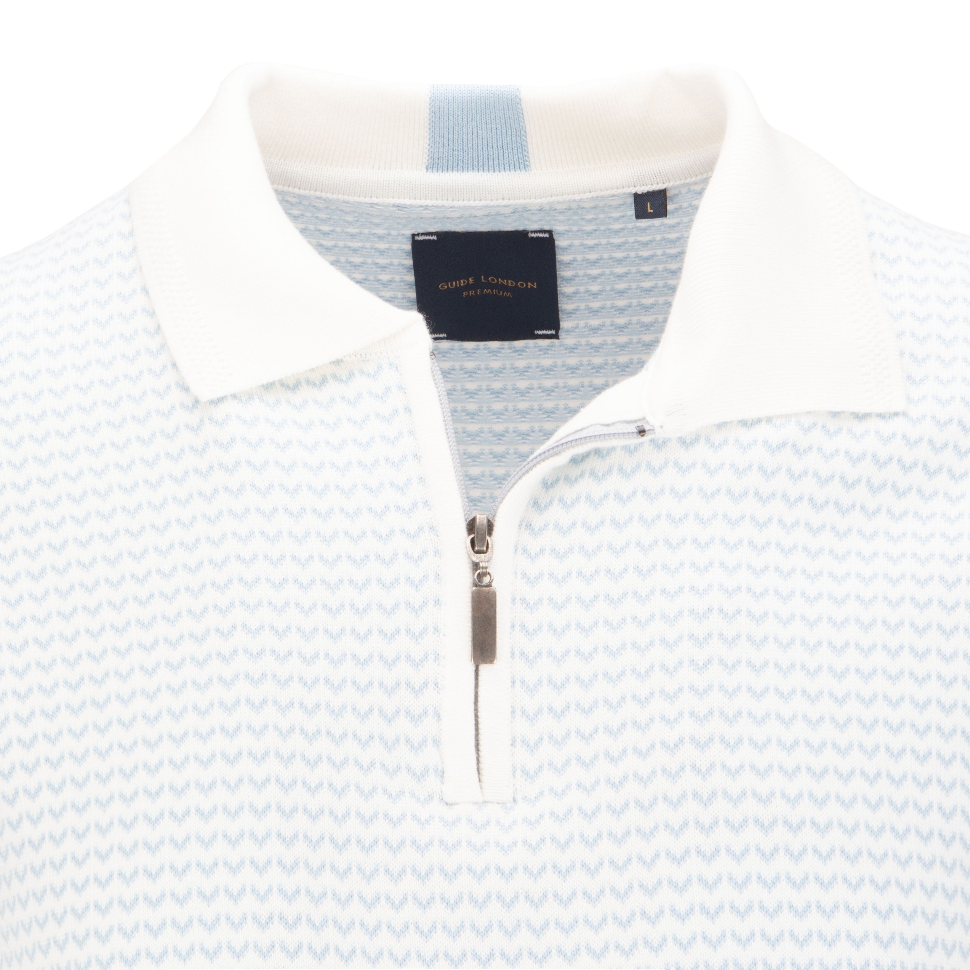 Introducing our Knitted Polo with Collar and Zip, a versatile addition to your wardrobe for any season. Crafted with precision and care, this jumper features a classic herringbone pattern in a refreshing colour combo of white and sky blue.