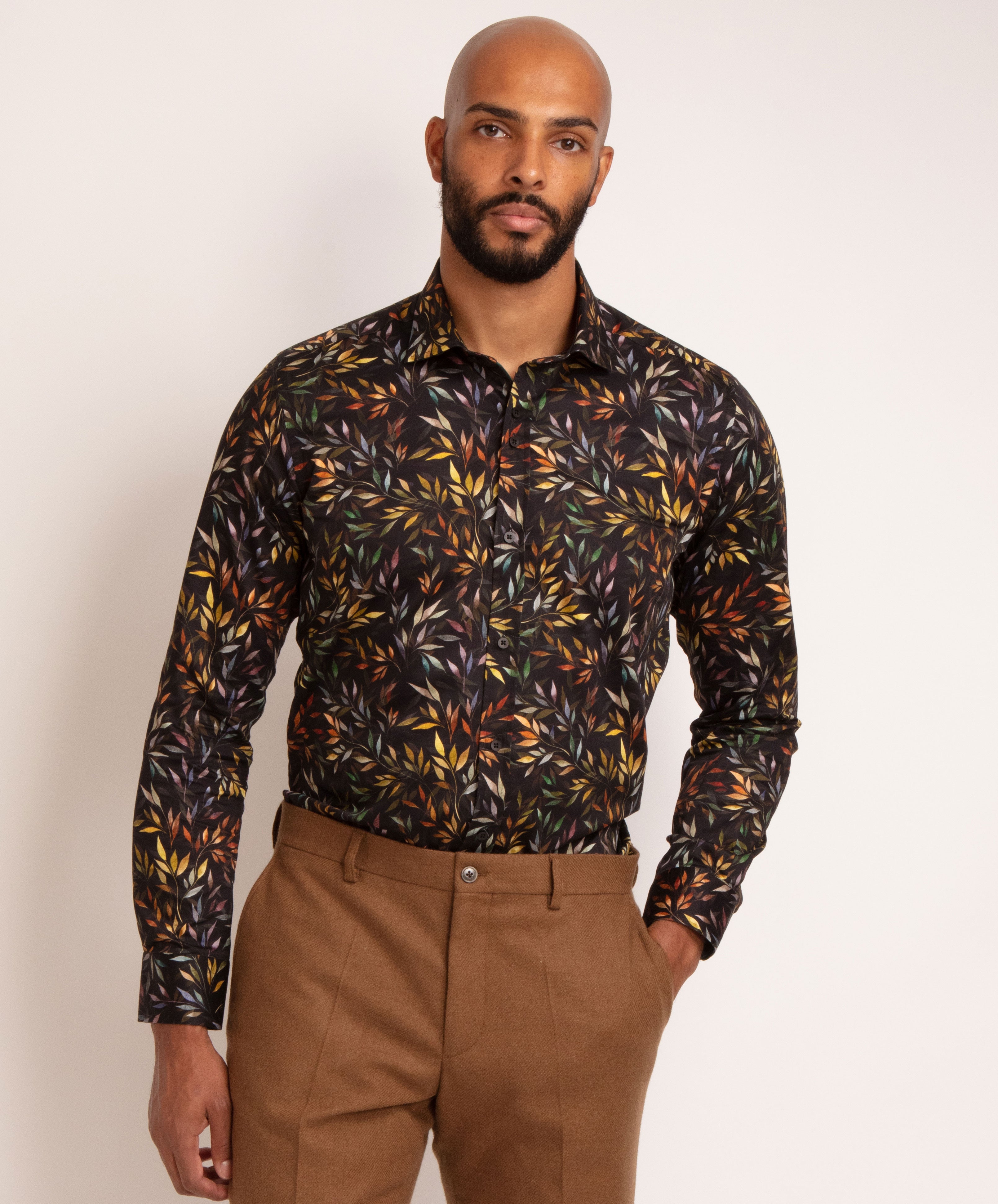 Dark bases with bright contrasting colours are always popular at Guide London, this shirt will stop anyone getting lost in the night. Yellows, oranges, reds, blues, pinks and greens on this rich black base.