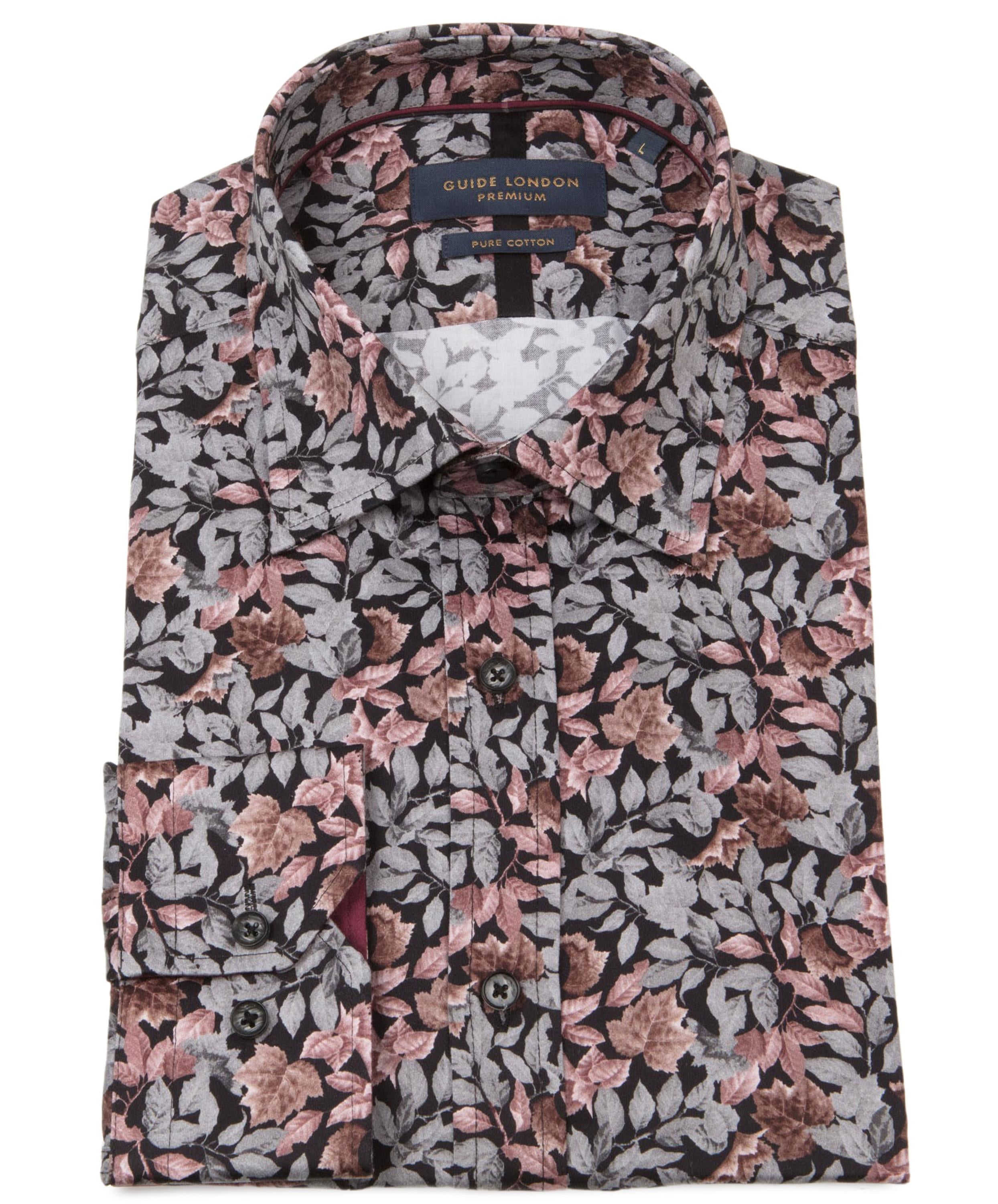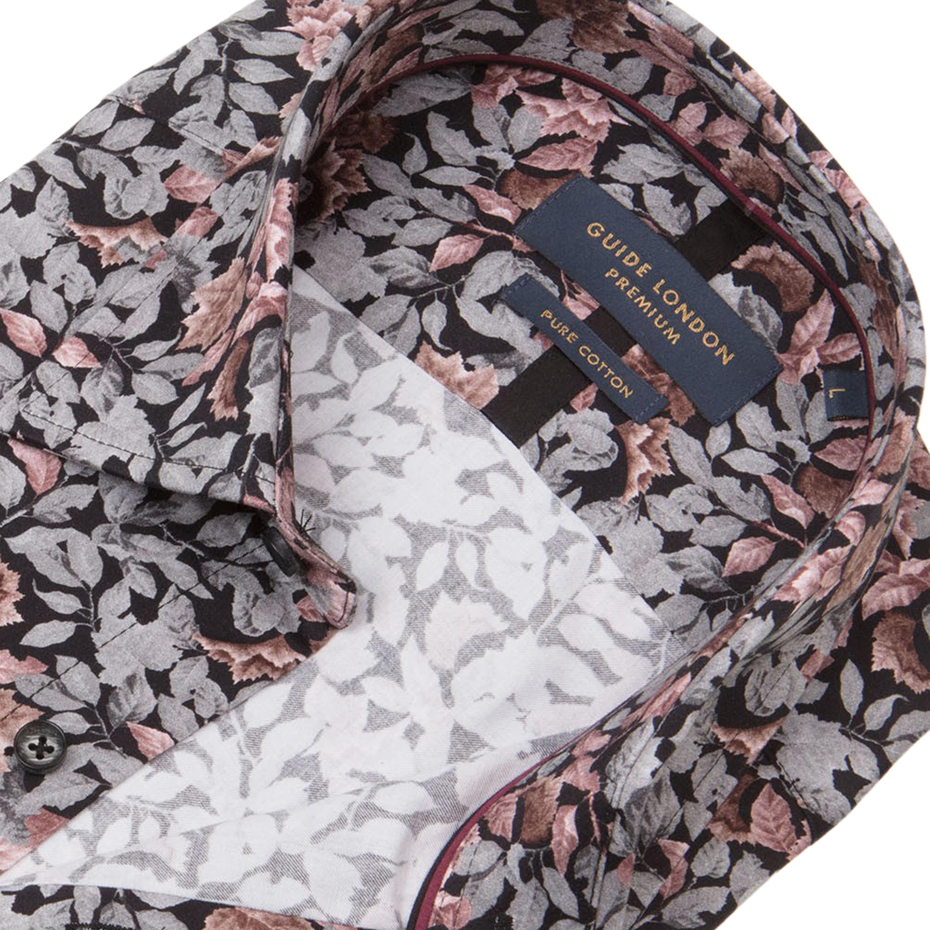 A deep rich black base, with autumn leaves in shades of soft red and grey, and the little trims on the inside, with a tonal black/grey button. This shirt is made with our soft touch pure cotton sateen finished fabric.