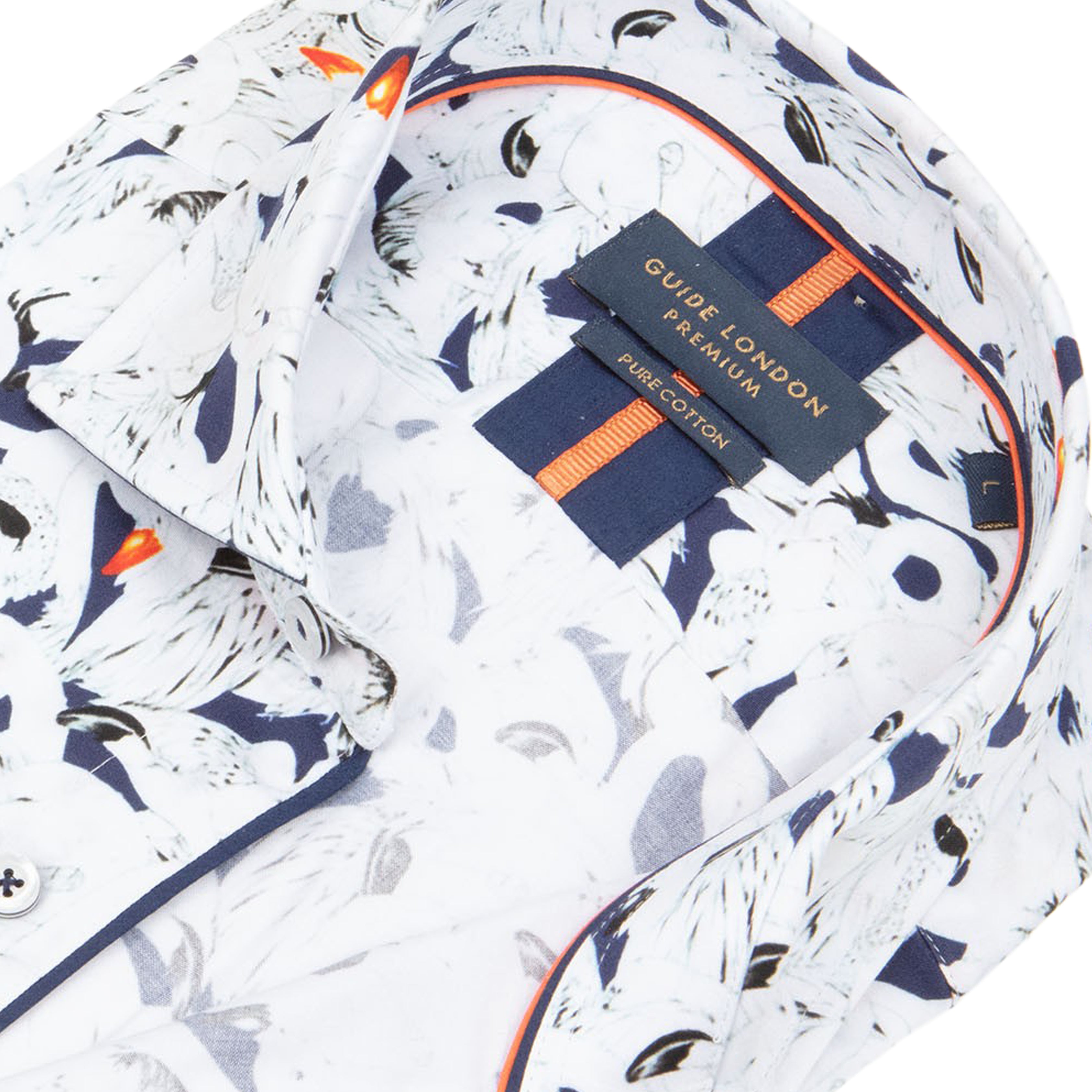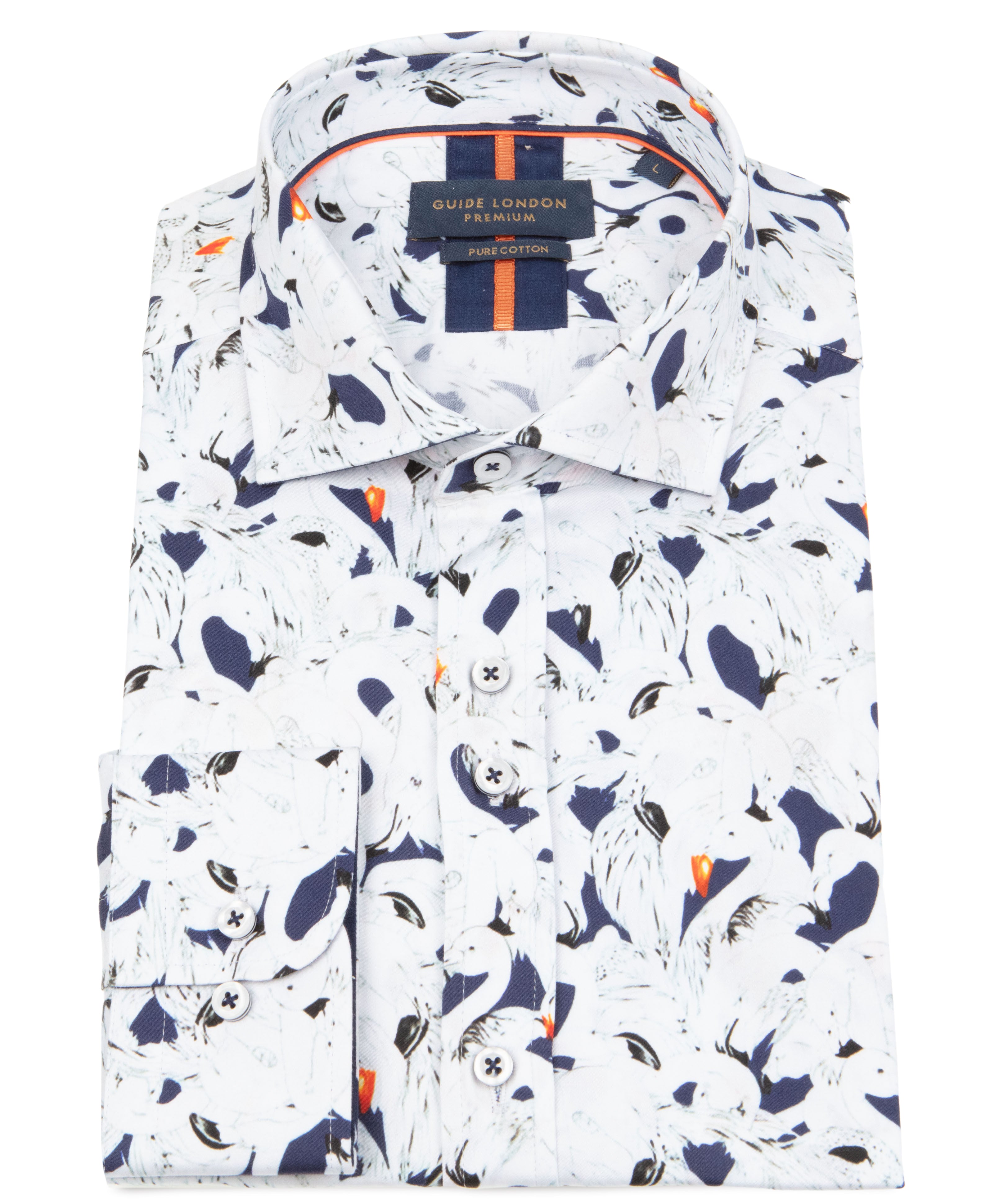 Make a stylish statement with our Long Sleeve Cotton Shirt featuring an elegant swan pattern in crisp white with intricate blue detailing and pops of vibrant orange. Crafted from soft, breathable cotton, this shirt is designed for comfort while offering a unique, eye-catching print that brings a fresh twist to your wardrobe.