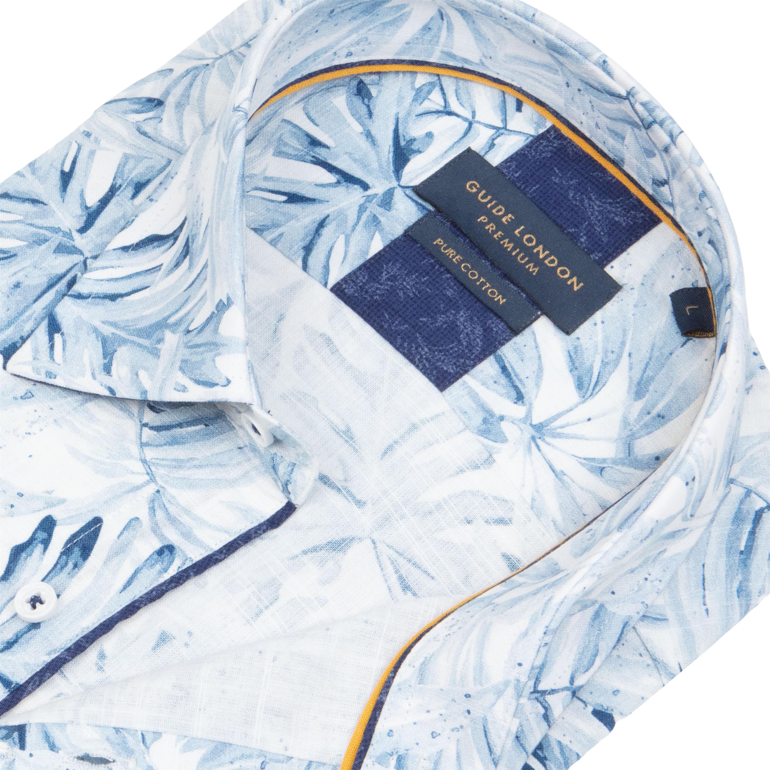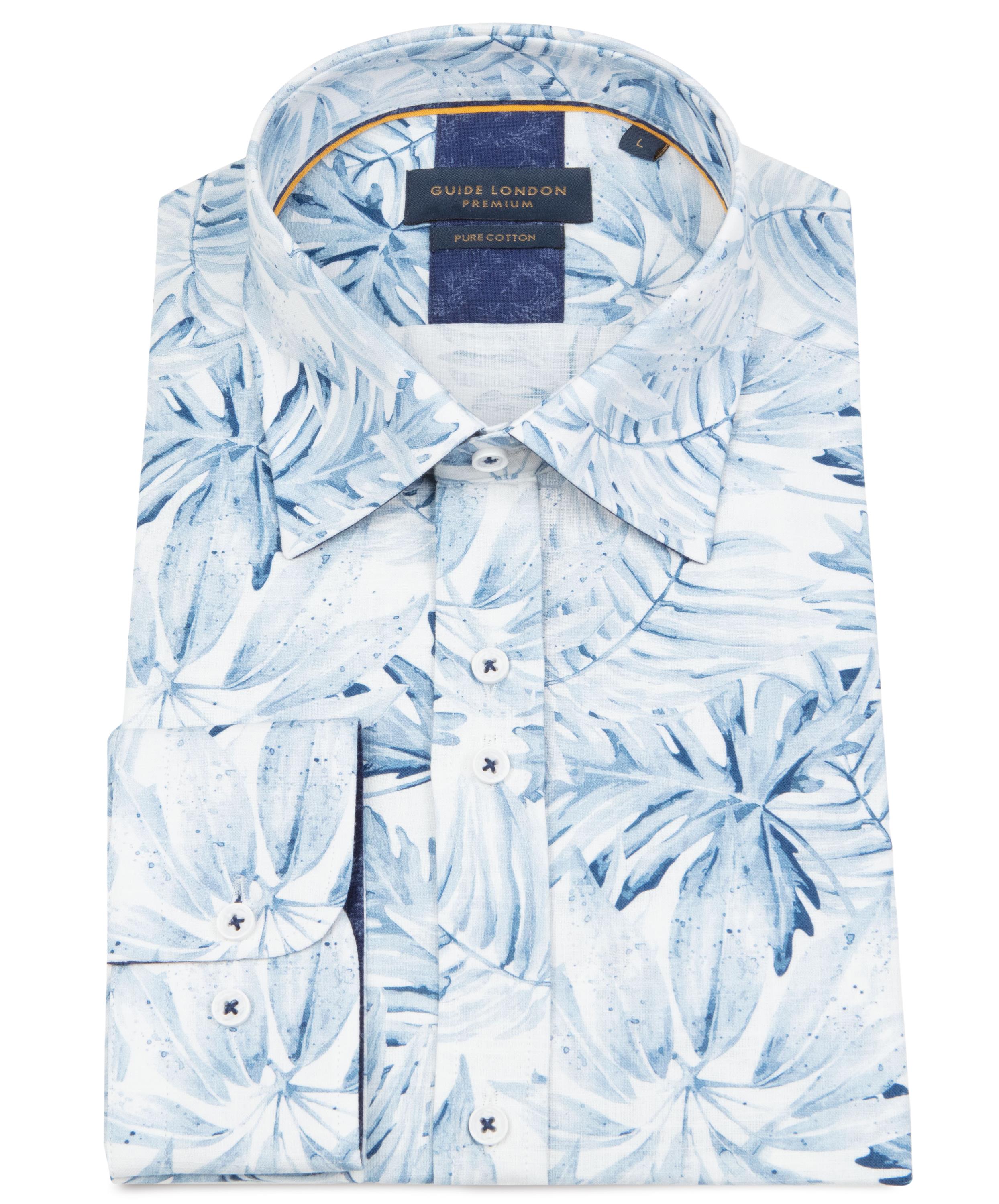 A textured cotton base, mimicking the texture of linen, but without the creasing. A soft coloured leaf design in shades of blue, on a white base colour.