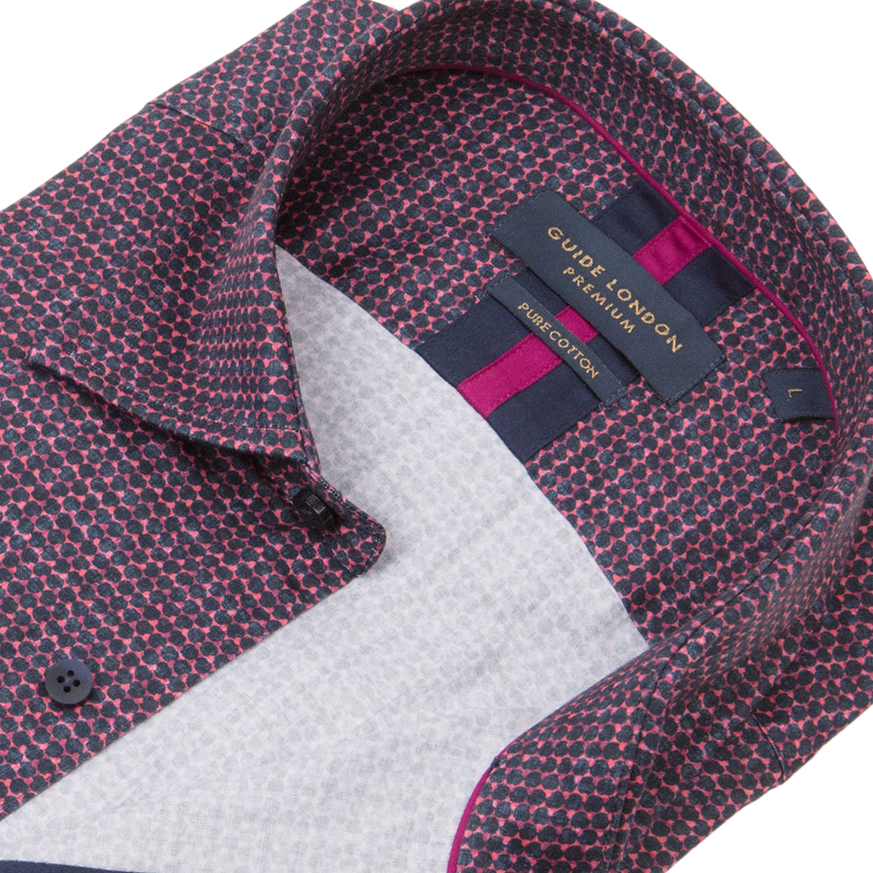 Bright pink and a soft navy are combined in this print to great effect, with added pink and navy in the collar. Printed on our soft touch pure cotton sateen finished fabric