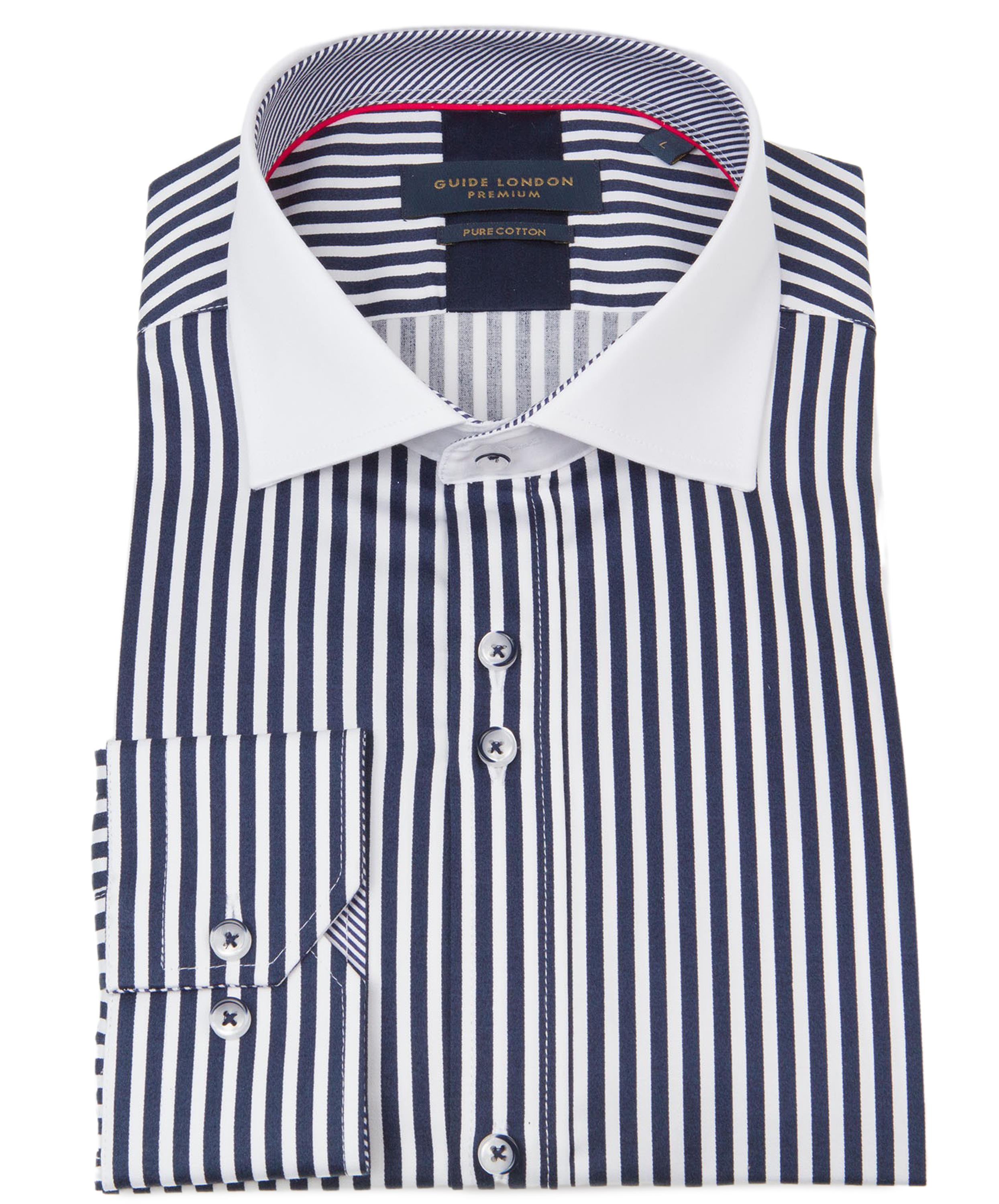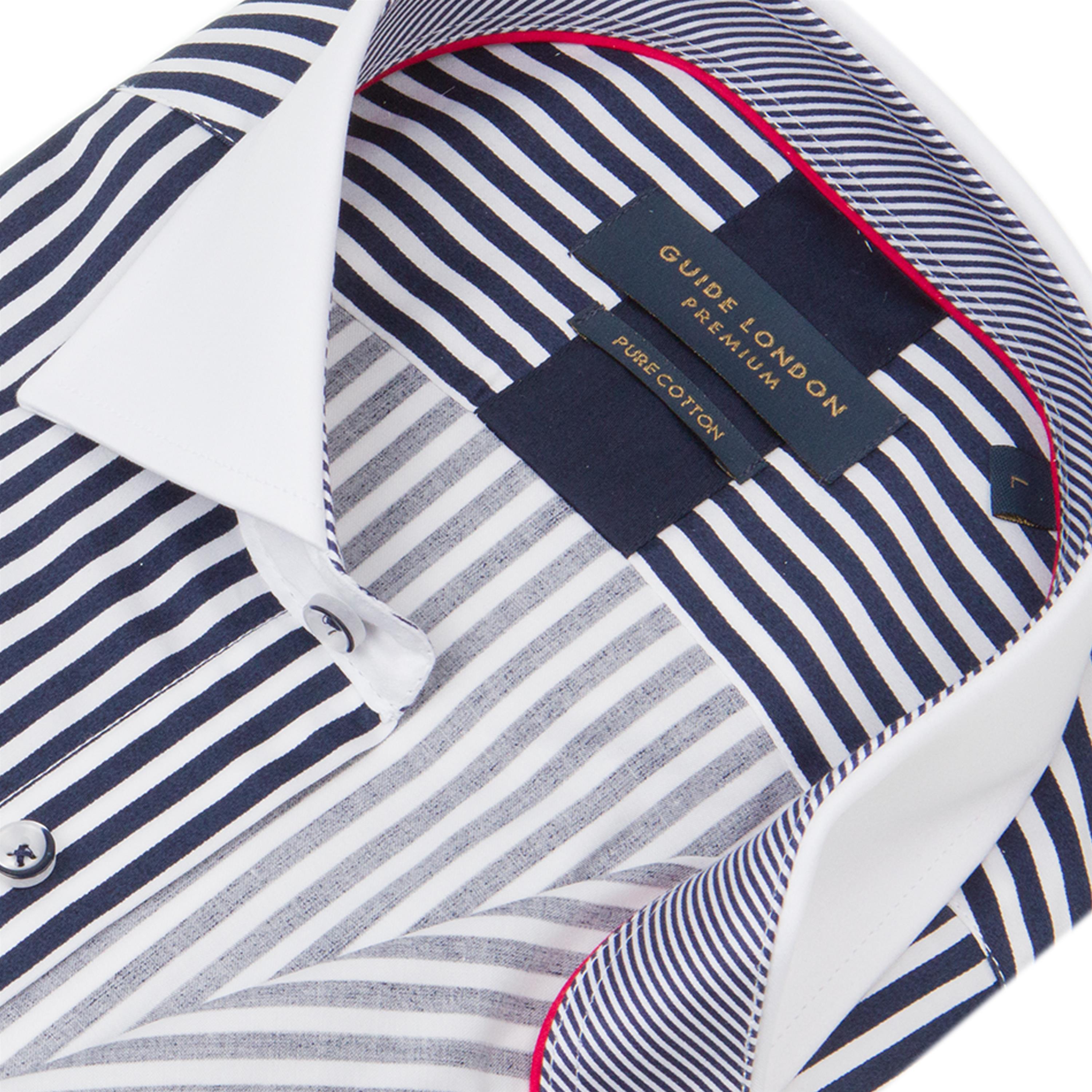 Our classic pure cotton premium sateen finished fabric with a block navy stripe printed on it. A clean solid white collar, with contrast mini stripe and red highlights inside the collar, and tonal crescent moon button.