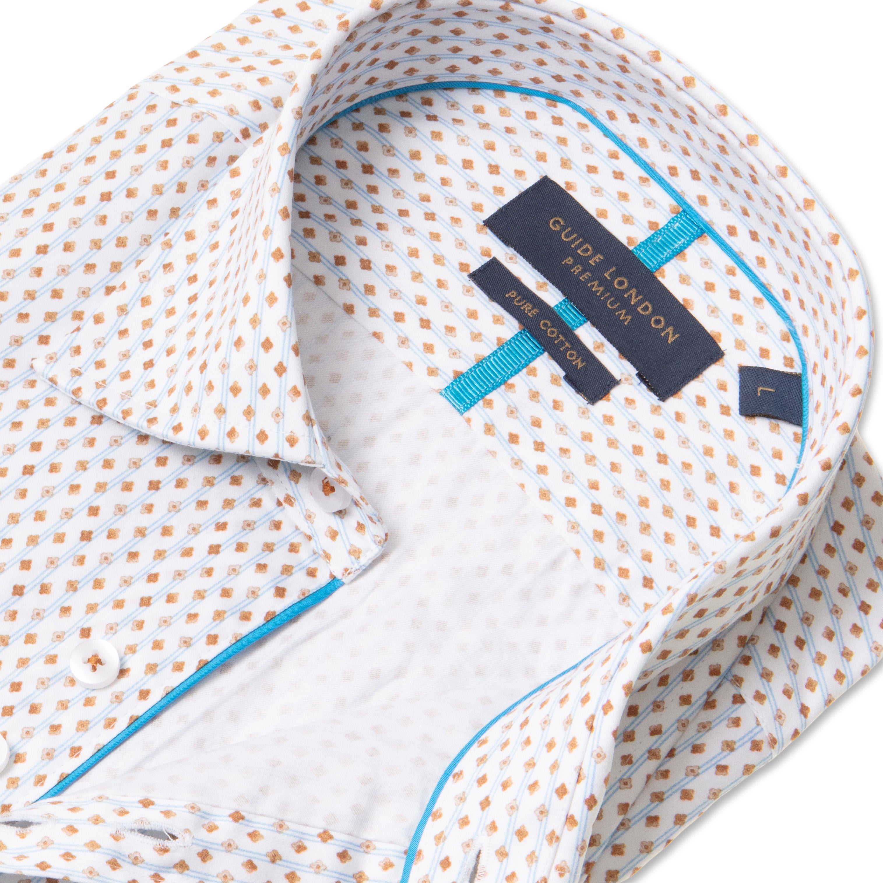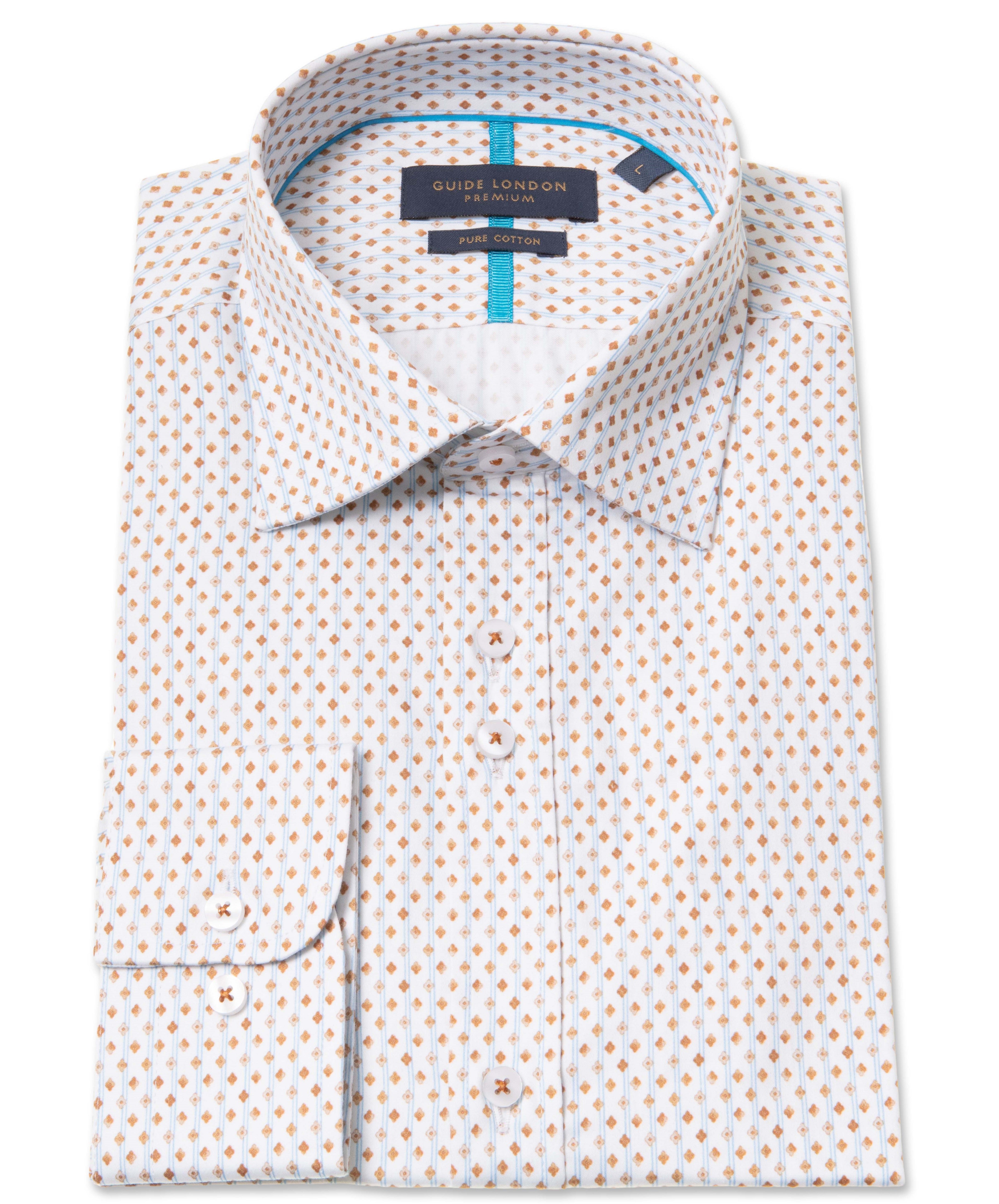 Upgrade your style with this shirt, a pure cotton sateen base fabric in a crisp white with soft blue stripes and a subtle tan diamond print. Perfect for a fun twist on a classic mens shirt. (Yeah, we're fancy like that!)