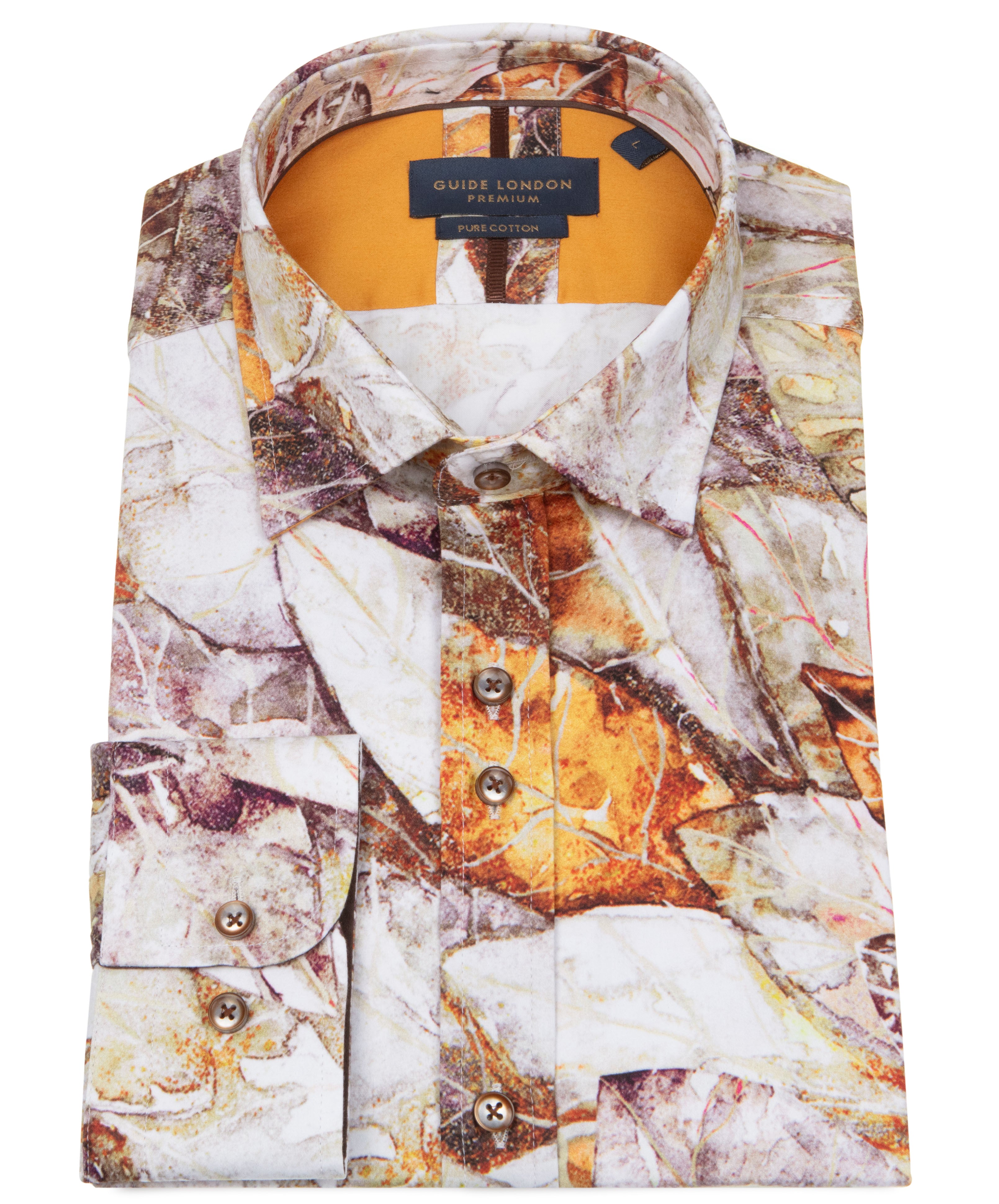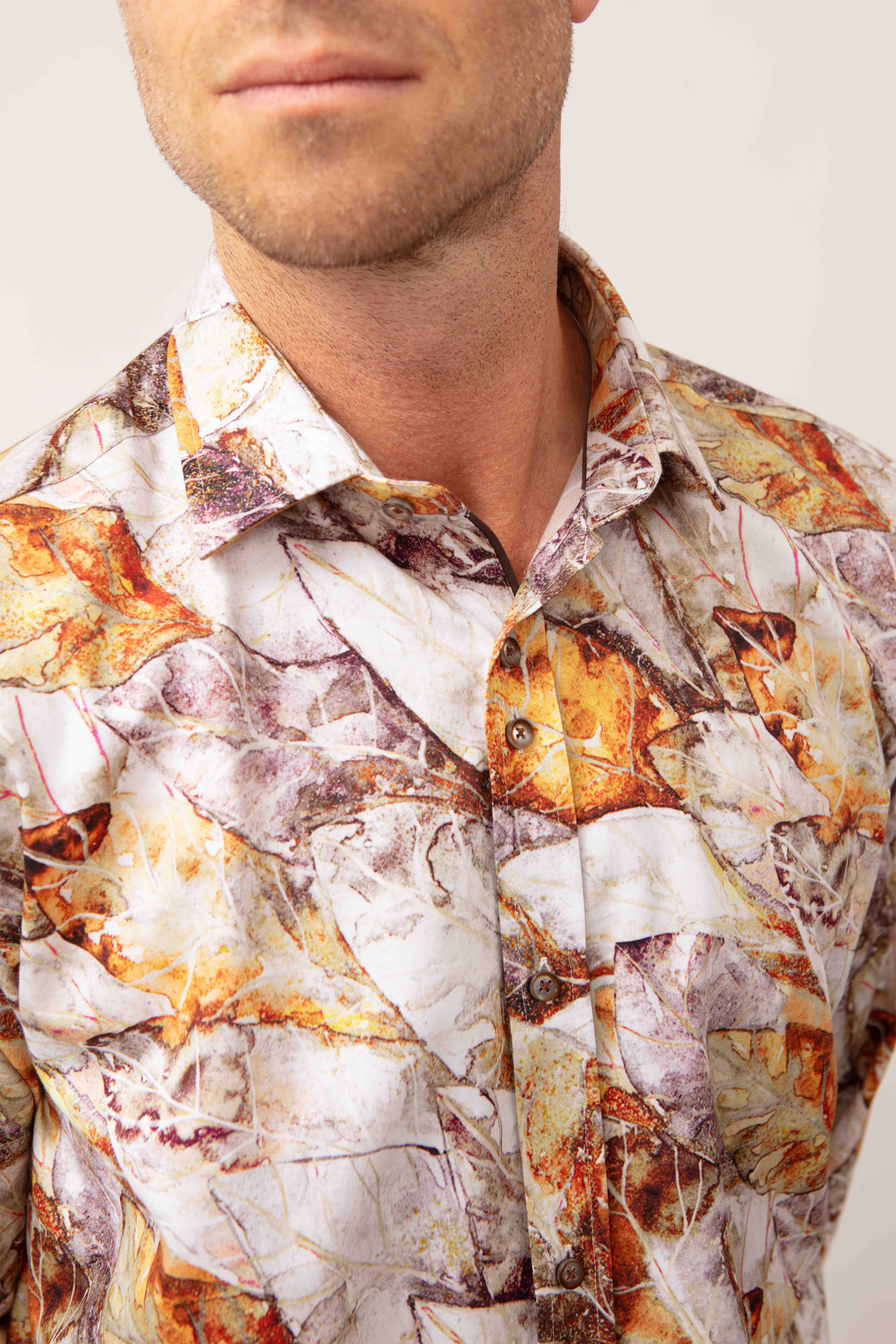 This shirt features a striking autumn leaf pattern adorned with rich shades of beige, tan, orange, and grey. It's a shirt that brings the warmth and elegance of the season to your wardrobe.