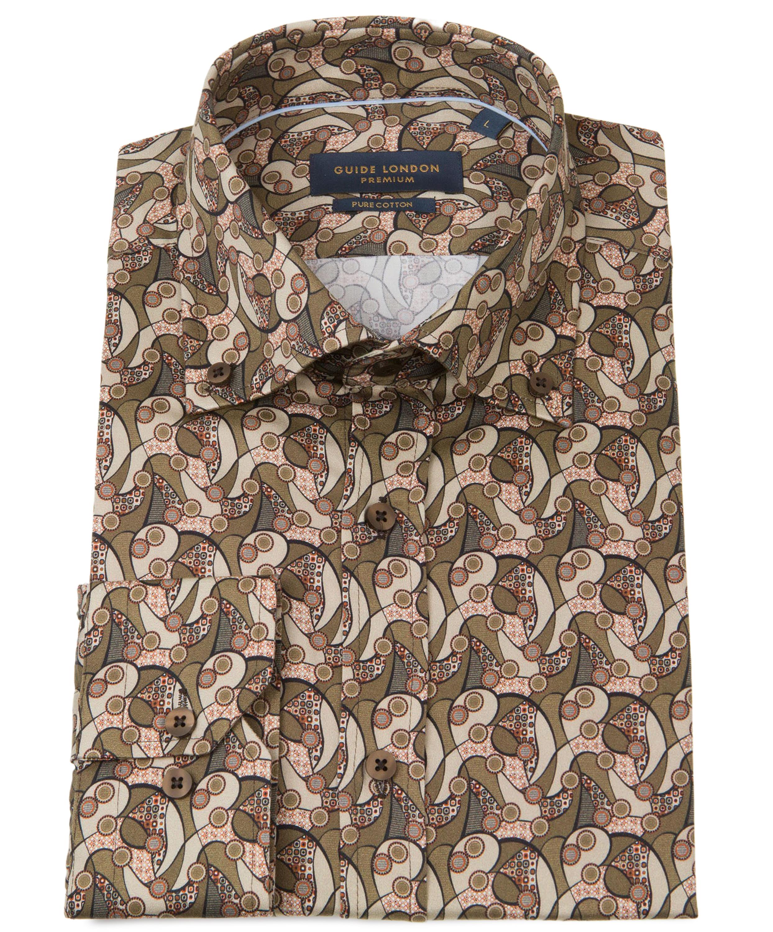 A quirky geometric design in shades of tan, with a bigger button down collar. Fun! As you expect, this is rinted on our soft touch pure cotton sateen finished fabric
