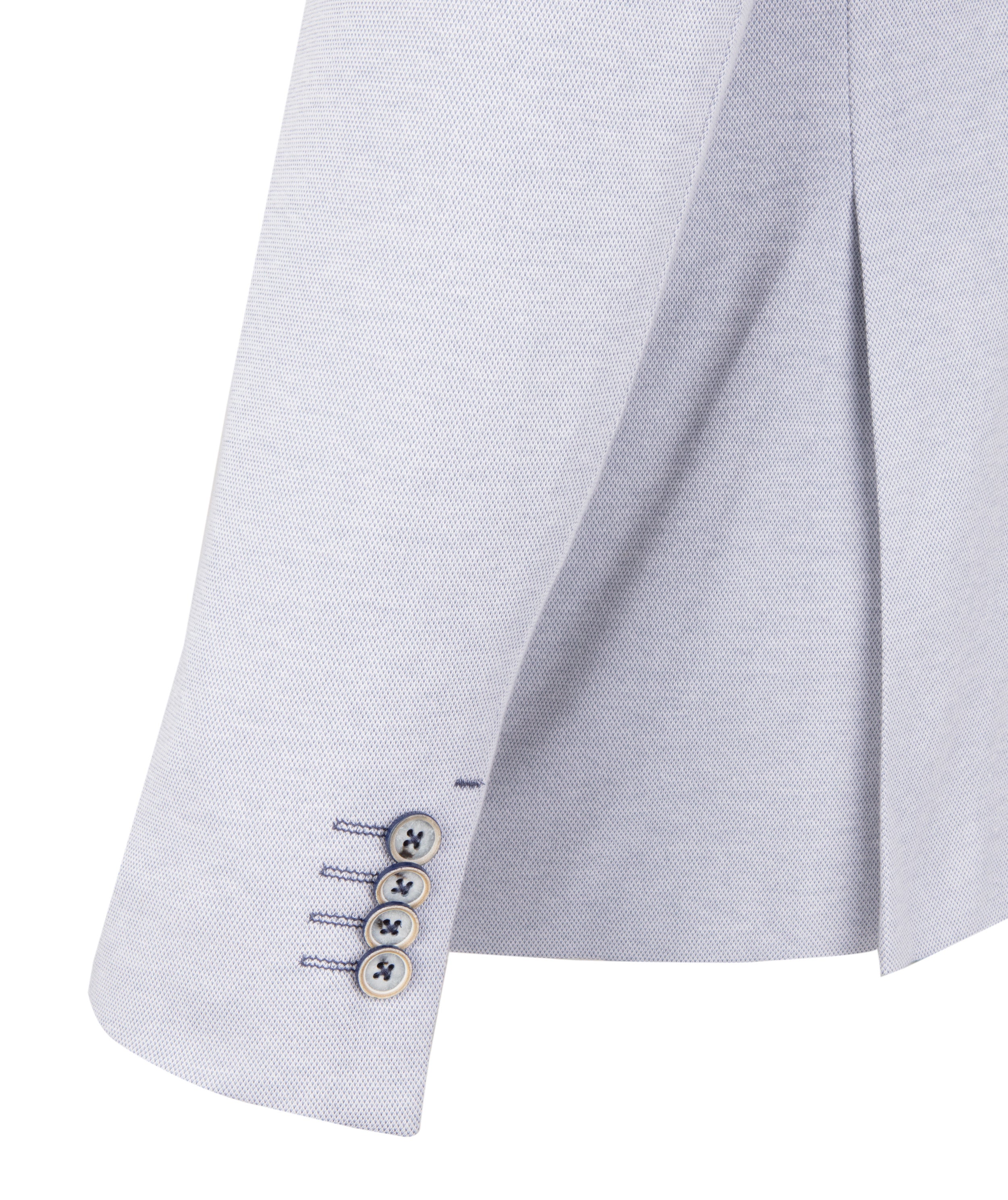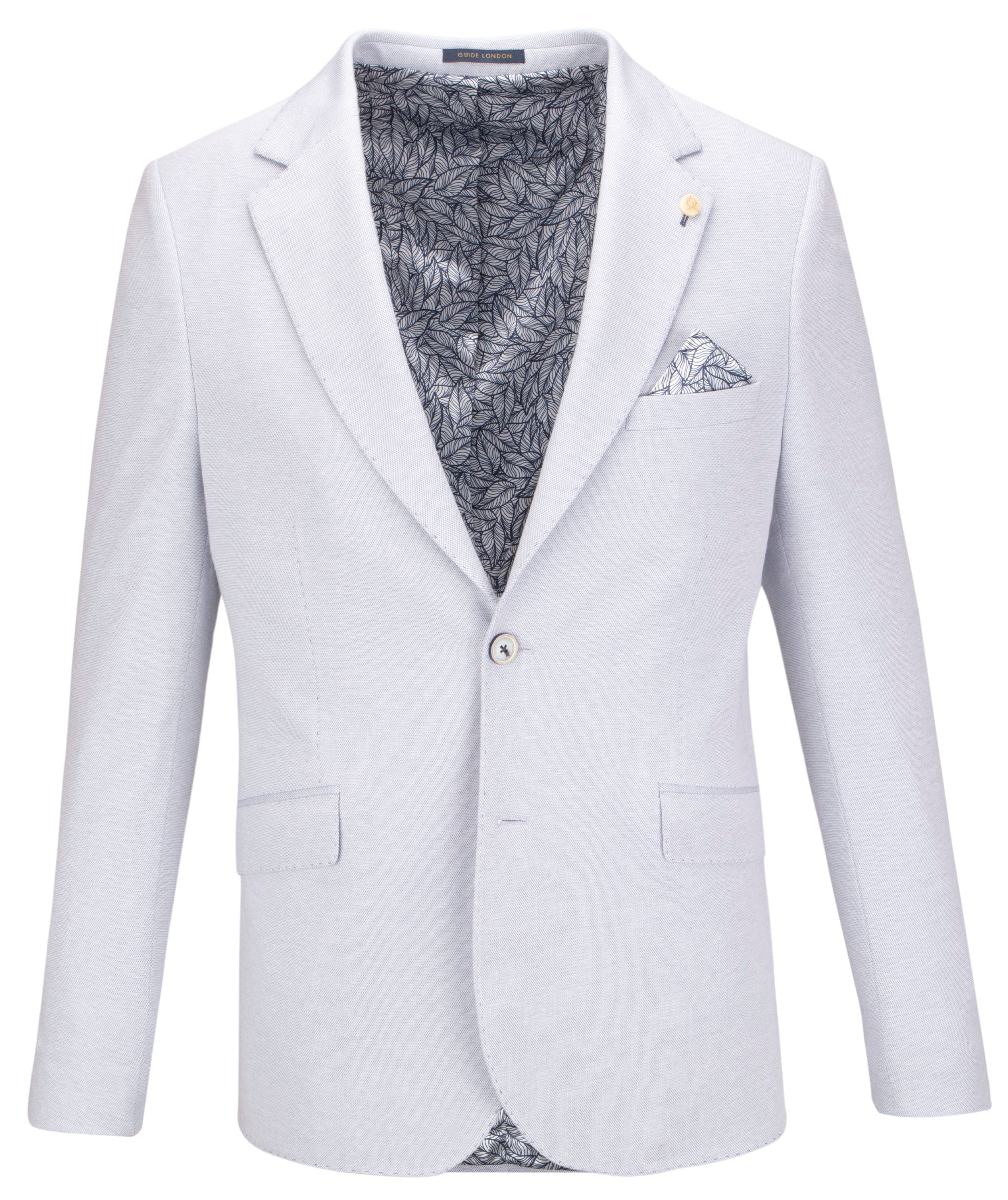 Introducing our modern cut jacket, designed to elevate your style with its contemporary flair. Crafted in a soothing light blue hue, this jacket features a subtle yet sophisticated navy leafy pattern lining the linen inside and adorning the square pocket.