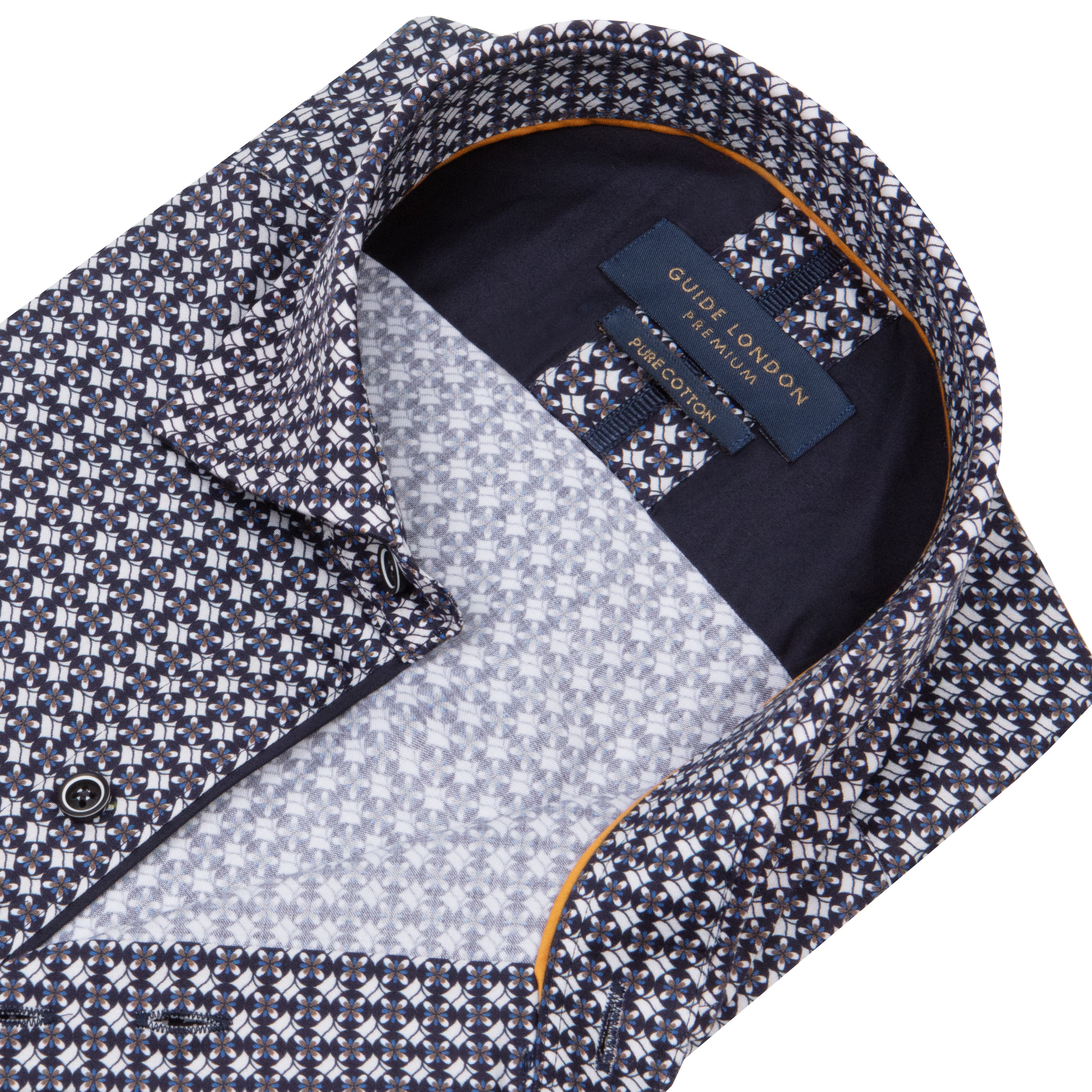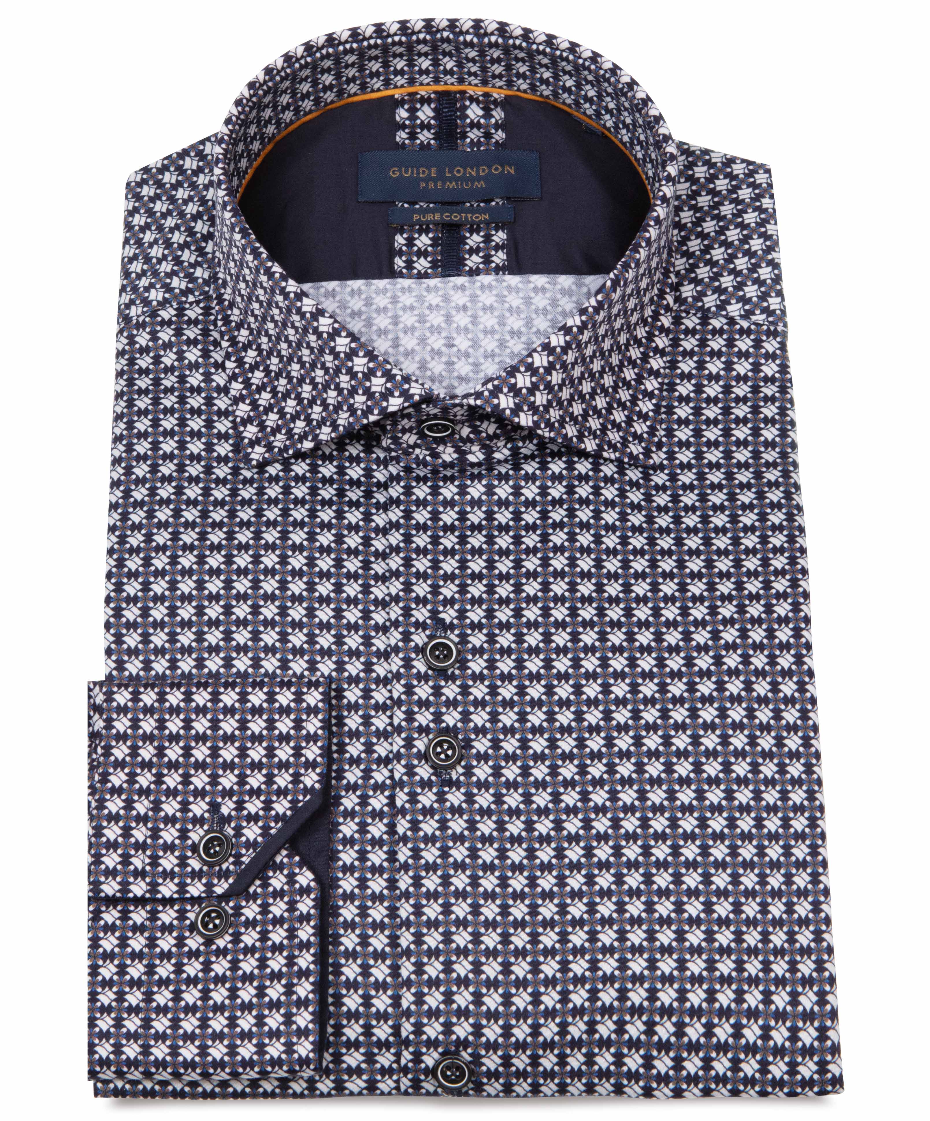 Add timeless elegance to your wardrobe with our 100% cotton shirt, featuring a striking geometric pattern in navy on an ecru background.