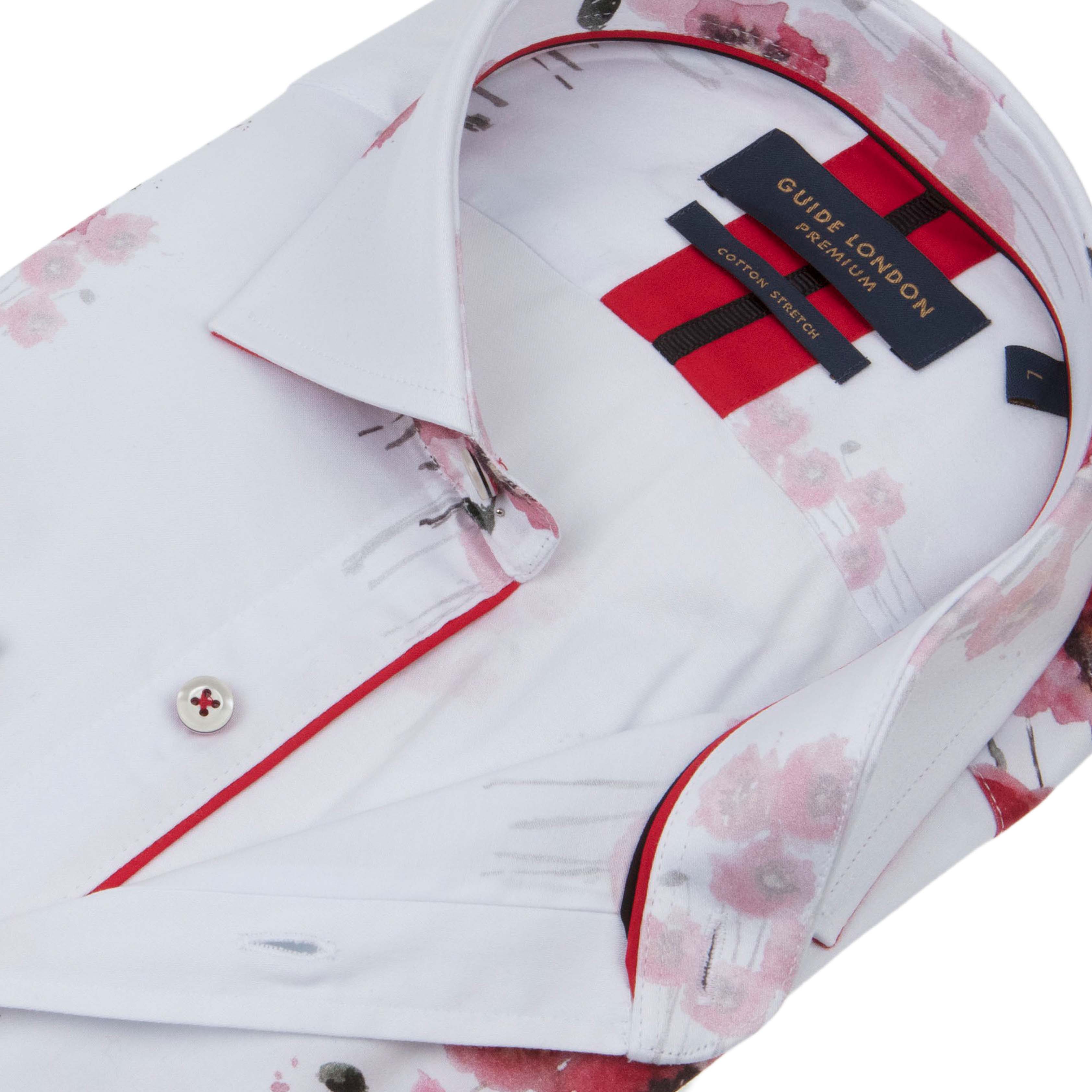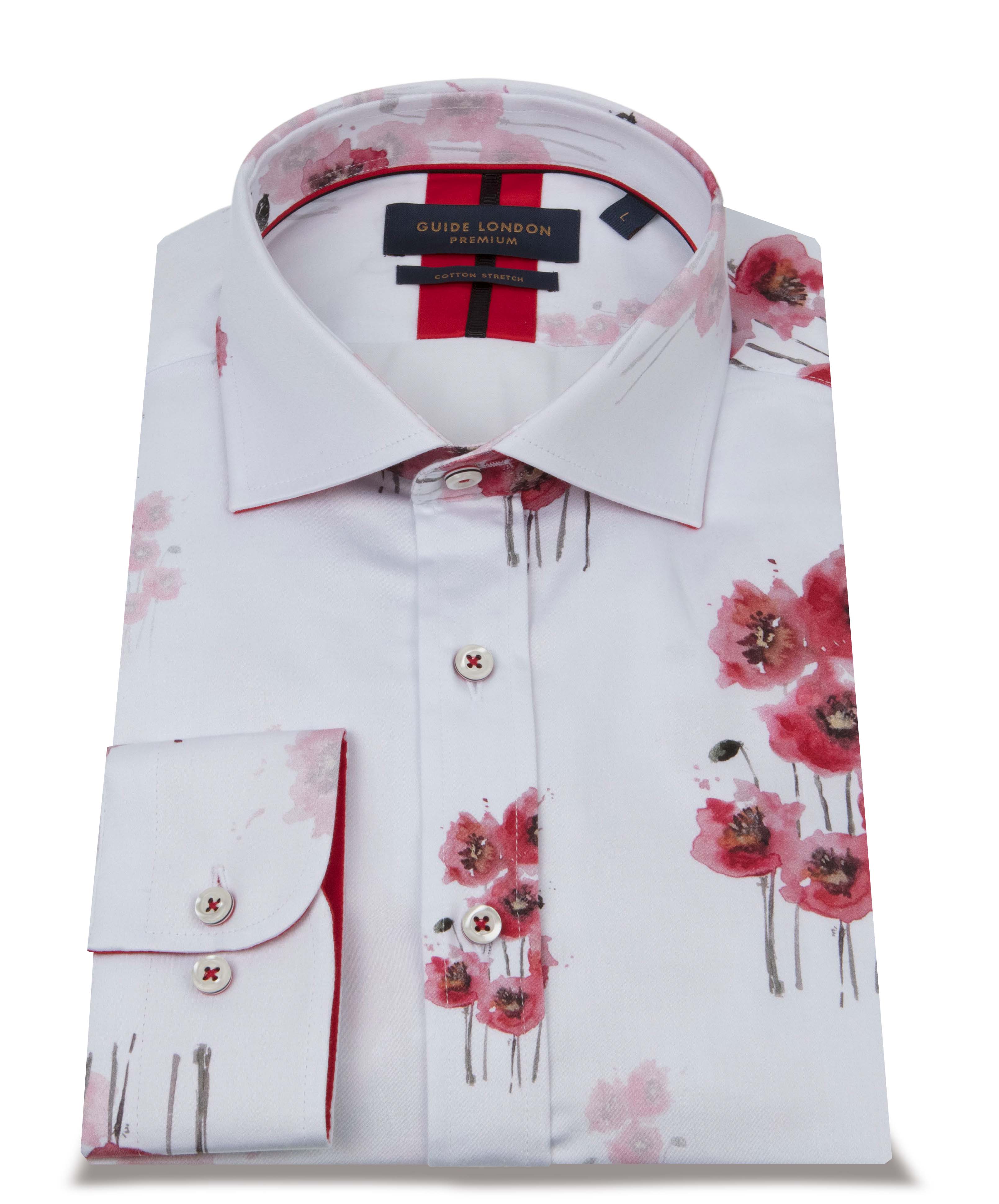 The vibrant red poppy, a symbol of Remembrance Day and the focus of this stunning printed shirt. Crafted in Stretch Cotton Sateen, the floral design is printed sparsely ensuring plenty of crisp white ground fabric is visible . Internal details in Red compliment the print perfectly.