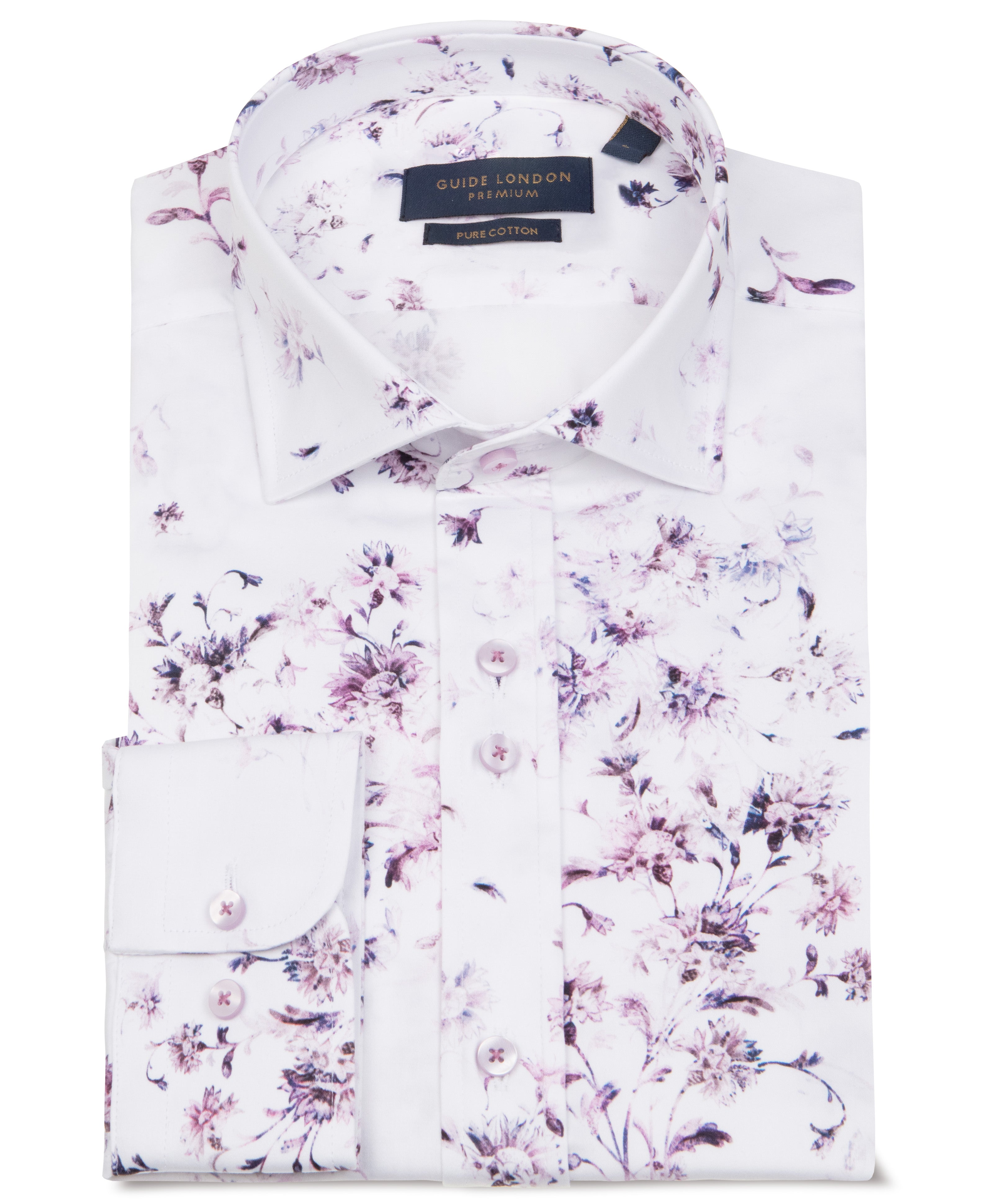 Adorned with a captivating floral pattern in shades of regal purple, accentuated with intricate details in navy, this shirt stands out against its pristine white canvas. The combination of colours and design elements creates a striking visual appeal that is sure to make a statement wherever you go.