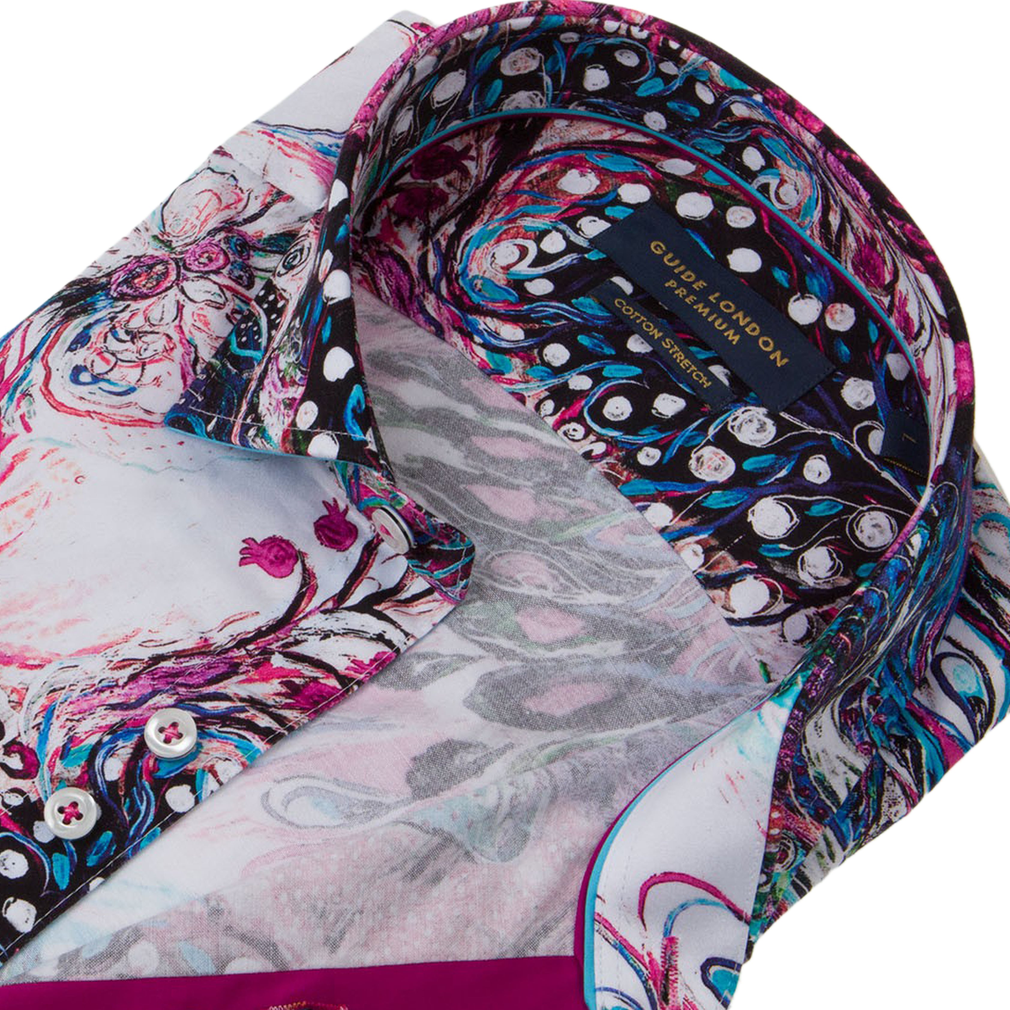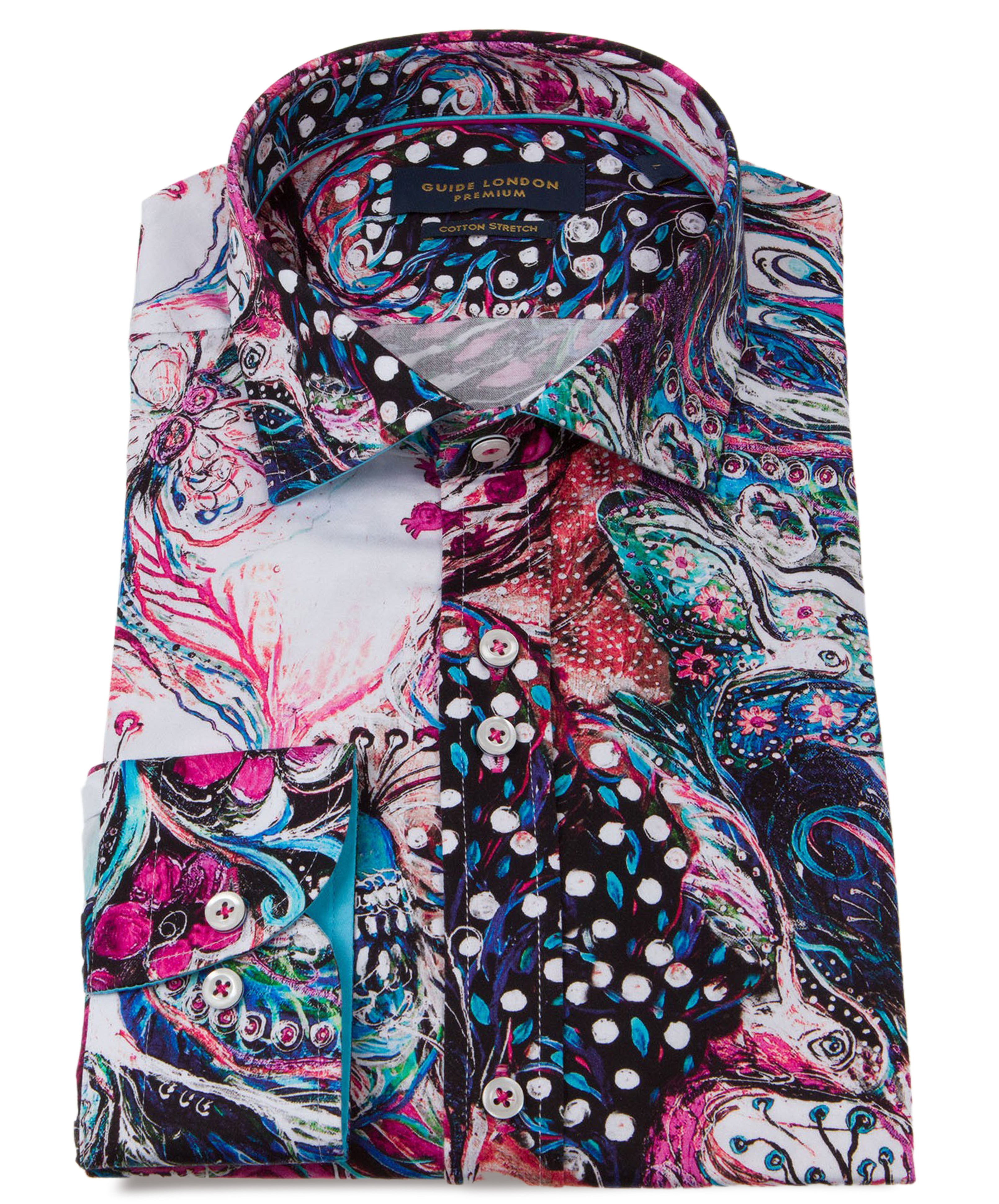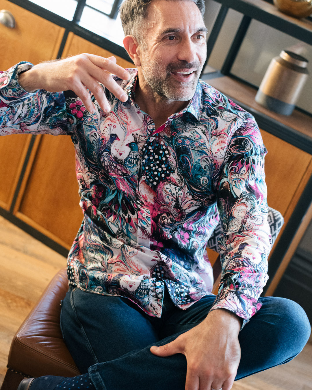 In this style it is all about the fabric. Flamboyant peacocks take centre stage surrounded by delightful floral blooms. More reminiscent of a piece of art than a piece of clothing, it is printed on our Stretch Cotton Sateen fabric and features an extreme curved cuff and internal details in Turquoise and Hot Pink. A real showstopper of a shirt!
