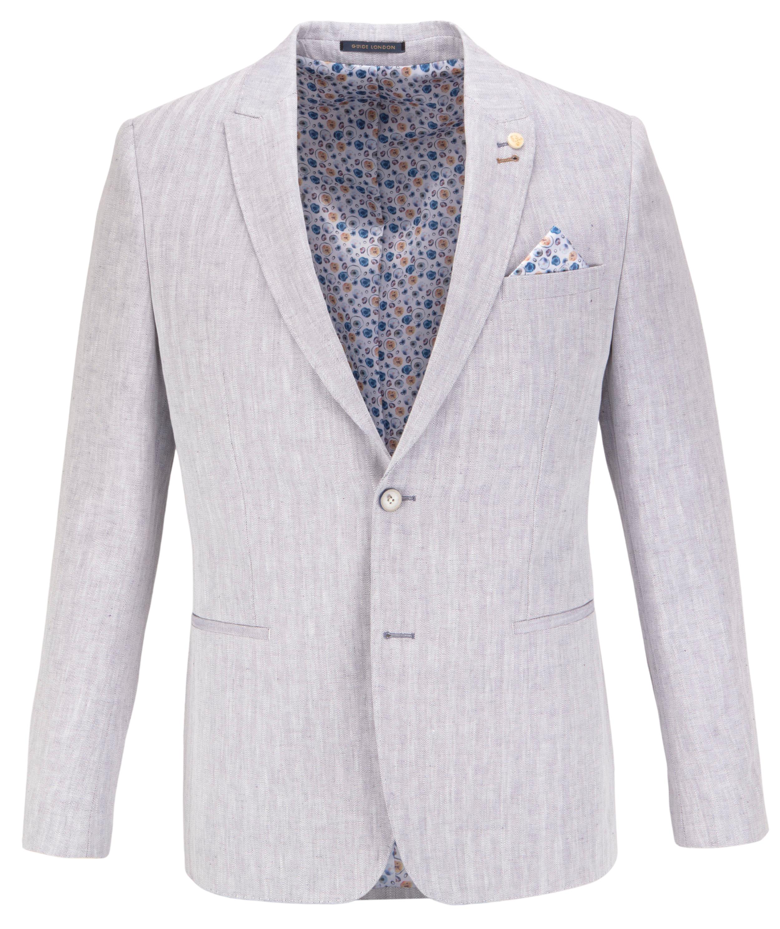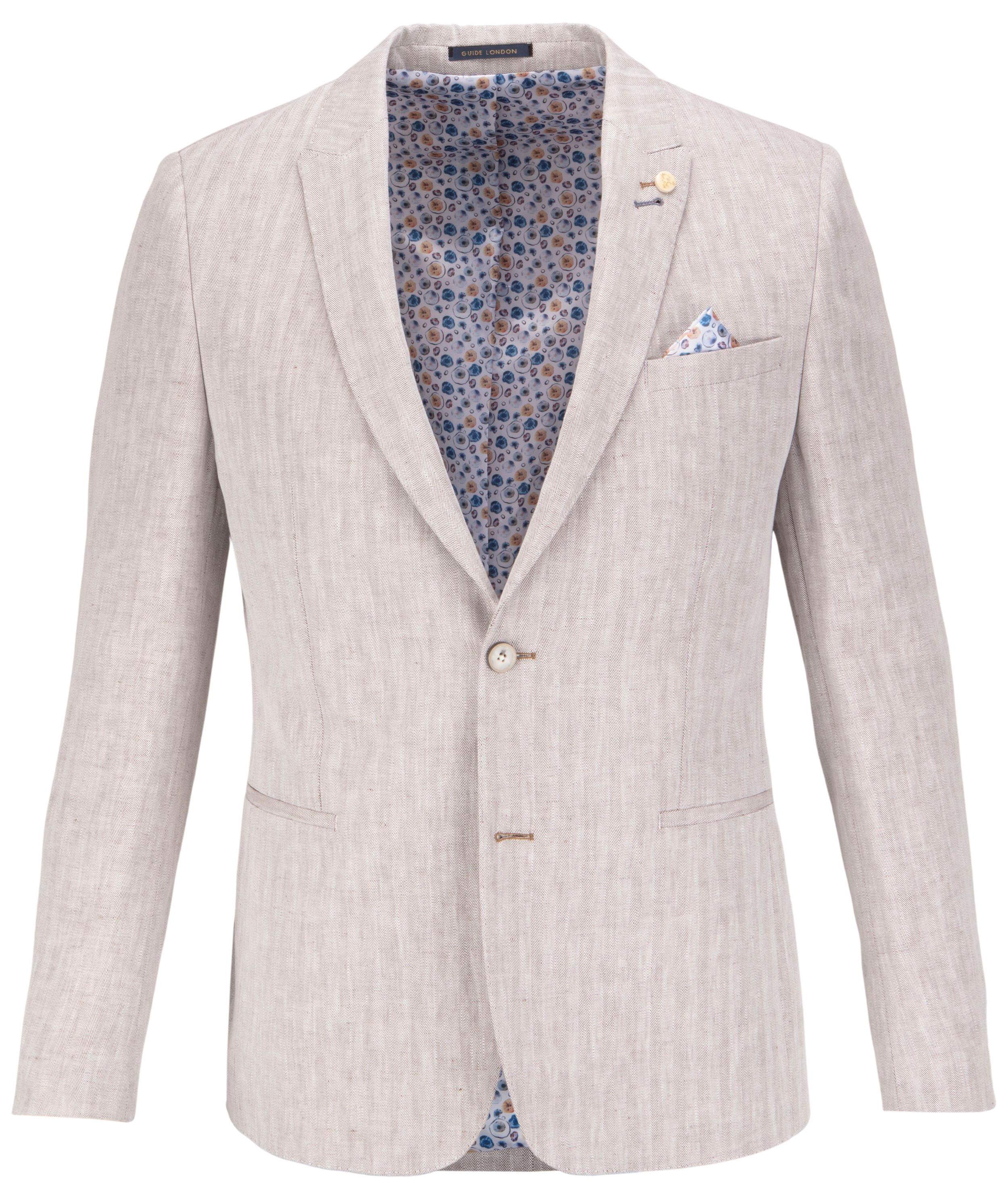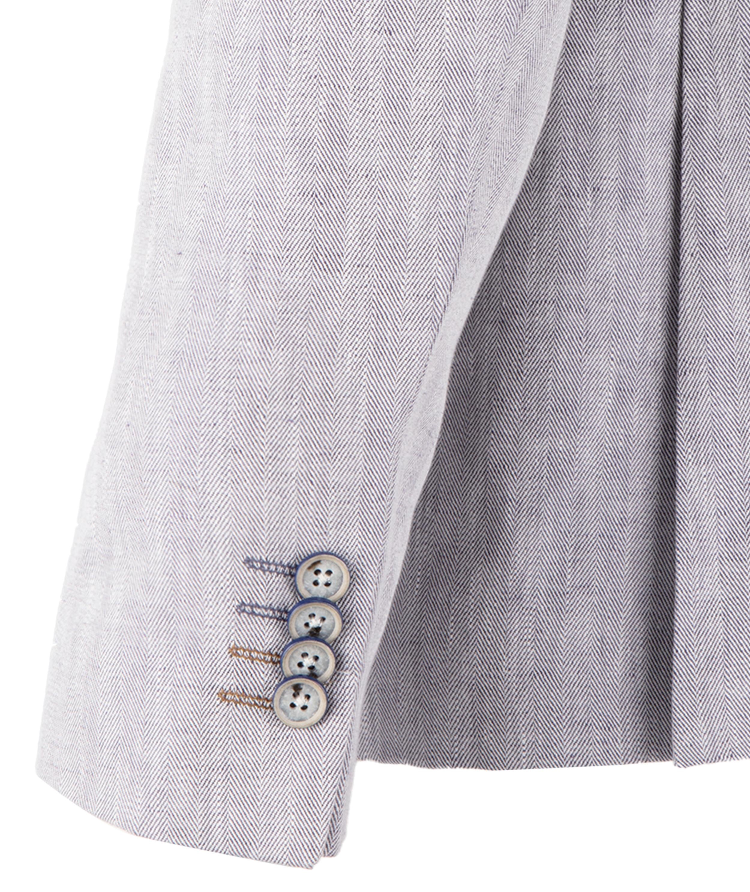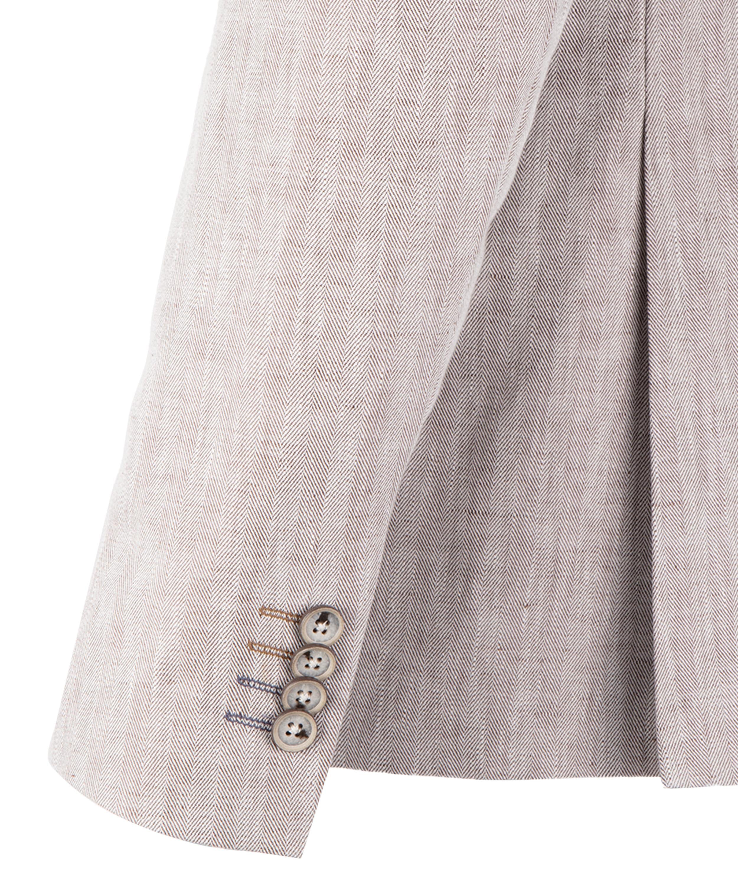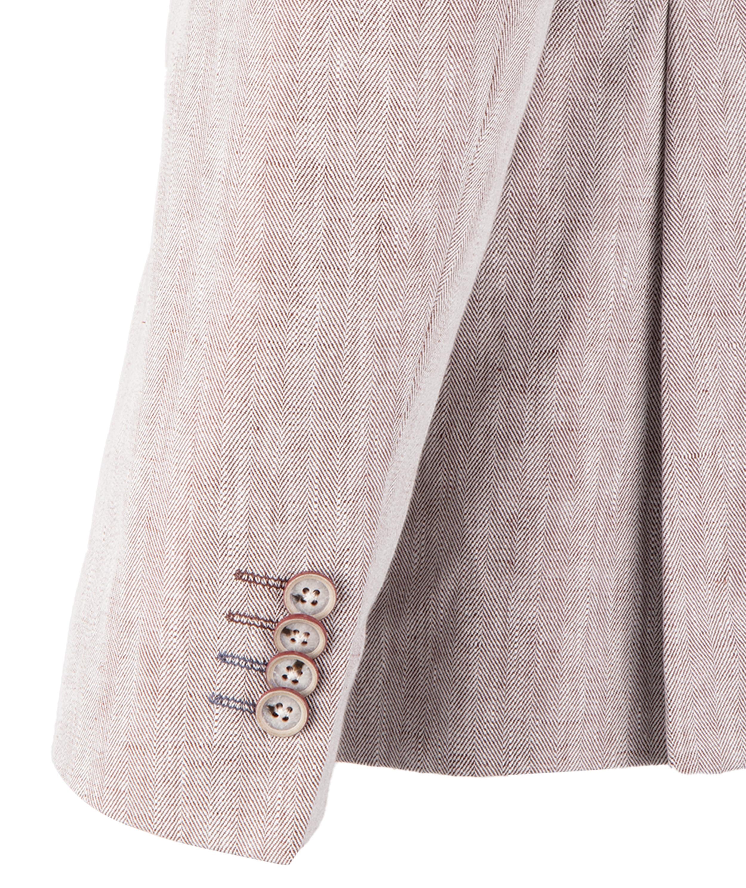 Blended cotton and linen in soft colours. The off white yarns blend with the coloured yarns to give a softed calmed down hue, brightened up by contrast stitching at the lapel and on the cuffs. The button faces are off-white with a little speckle, and the reverse is tonal to the body fabric. The burgundy is matched by shirt LS76523, with the navy and tan matching LS76519