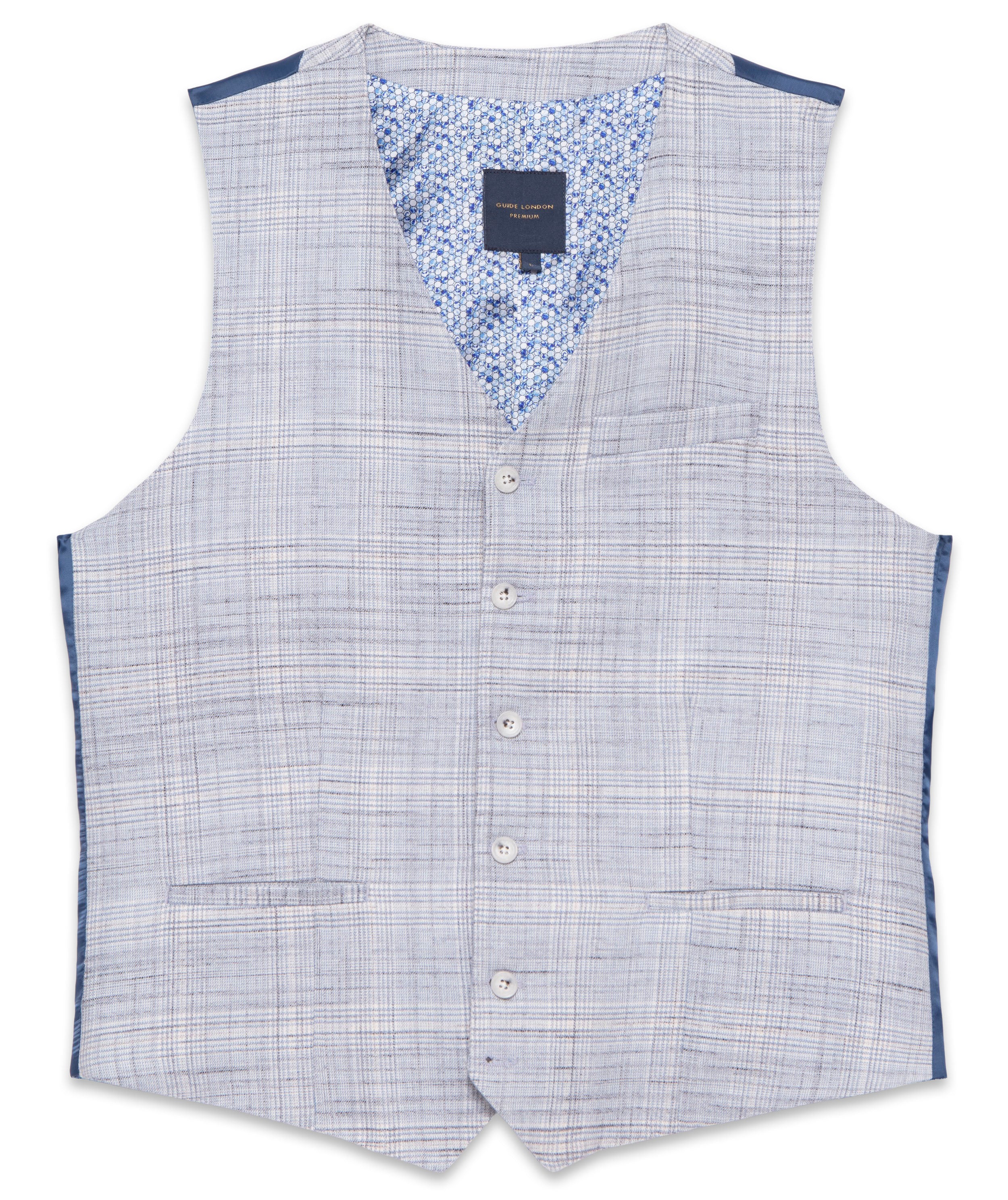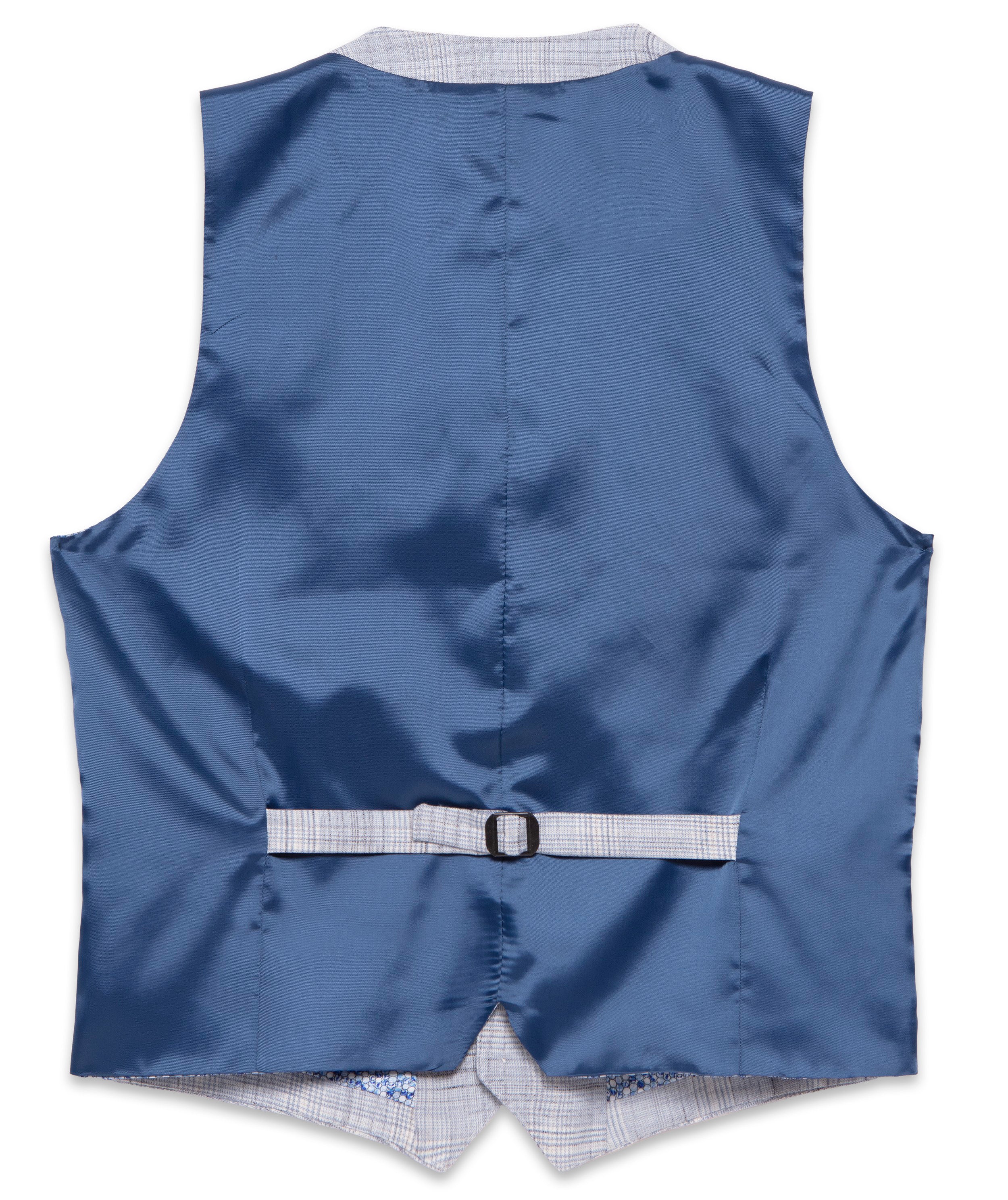 This soft melange check waistcoat in light blue exudes understated elegance. Its tonal lining print design adds a touch of sophistication to any outfit, making it the perfect addition to your wardrobe. Crafted with precision and taste, it is the epitome of luxury fashion.