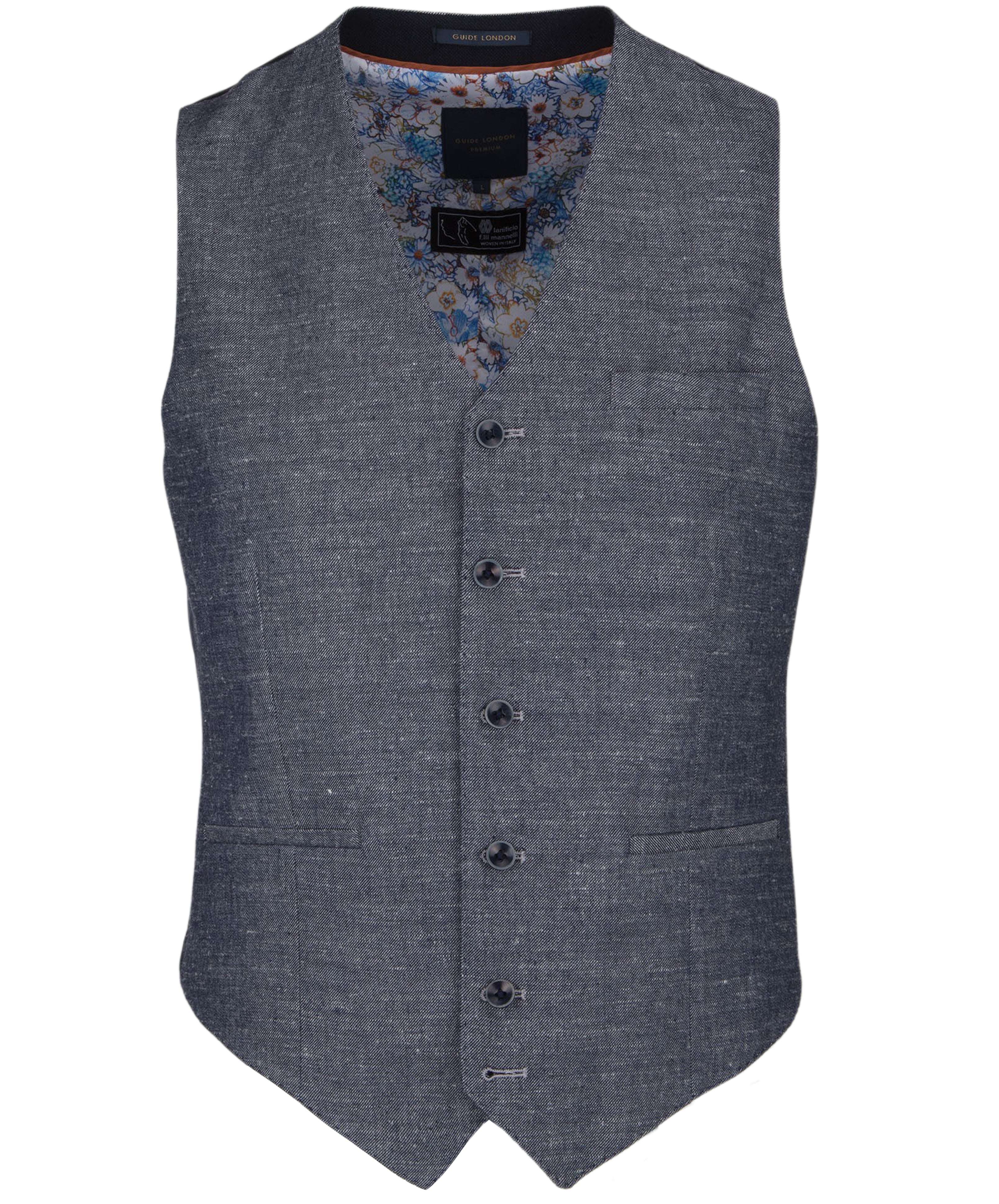 The perfect fabric for those warmer months this sleek waistcoat is crafted in a light Navy Italian Cotton and Linen blend. Featuring a contrast panel at the inside collar, a welt pocket at the chest and two welt pockets at the waist, and a stunning floral print lining. Style with the matching blazer, trouser and shirt for the Guide total look.