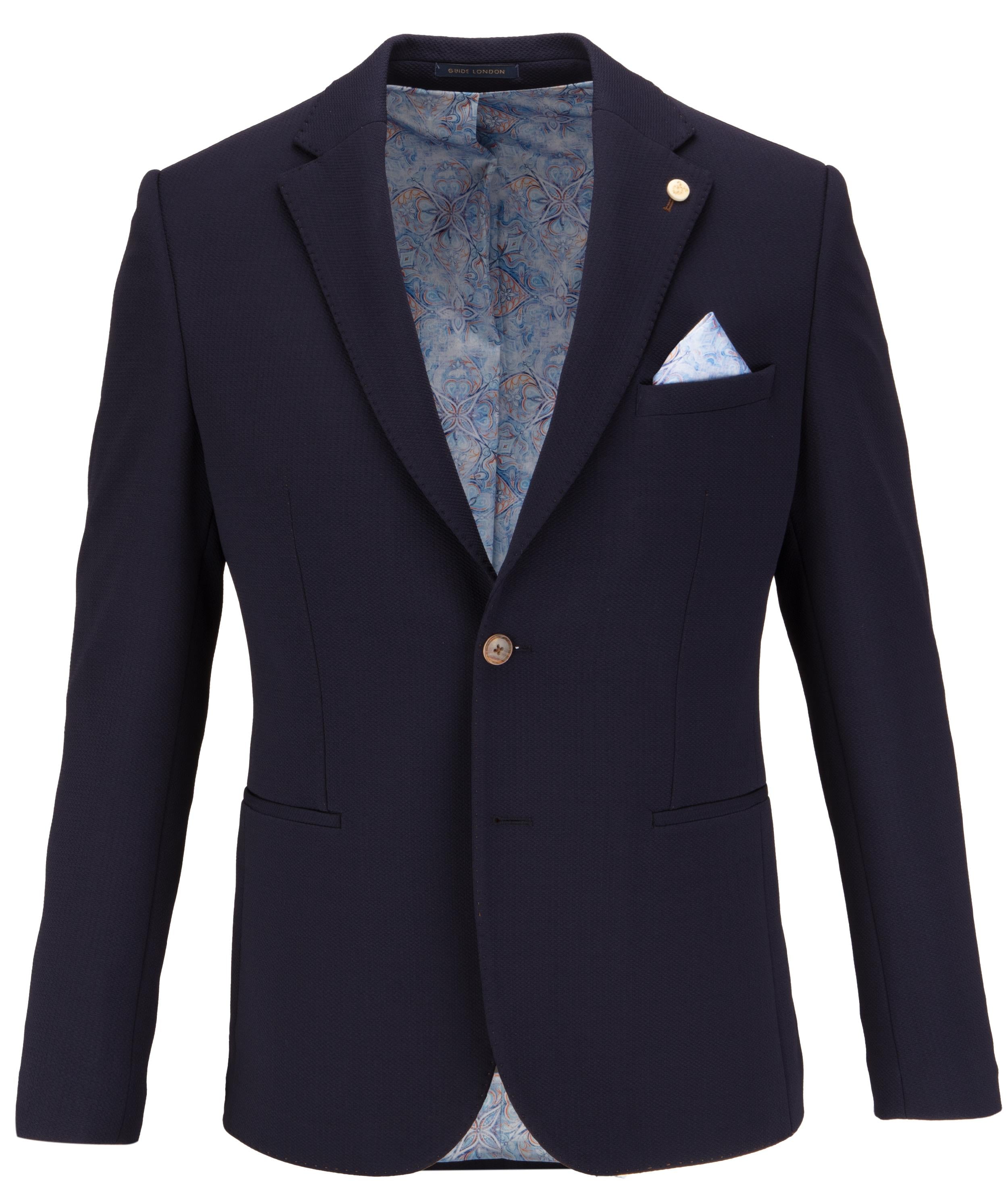 A deep navy jersey blazer, with a subtle texture, smoked wood effect buttons, and lining matching our shirt LS76471. Both the main jersey fabric and the lining fabric are made from stretch materials, making a baxer like this one of the most comfortable you will ever wear!