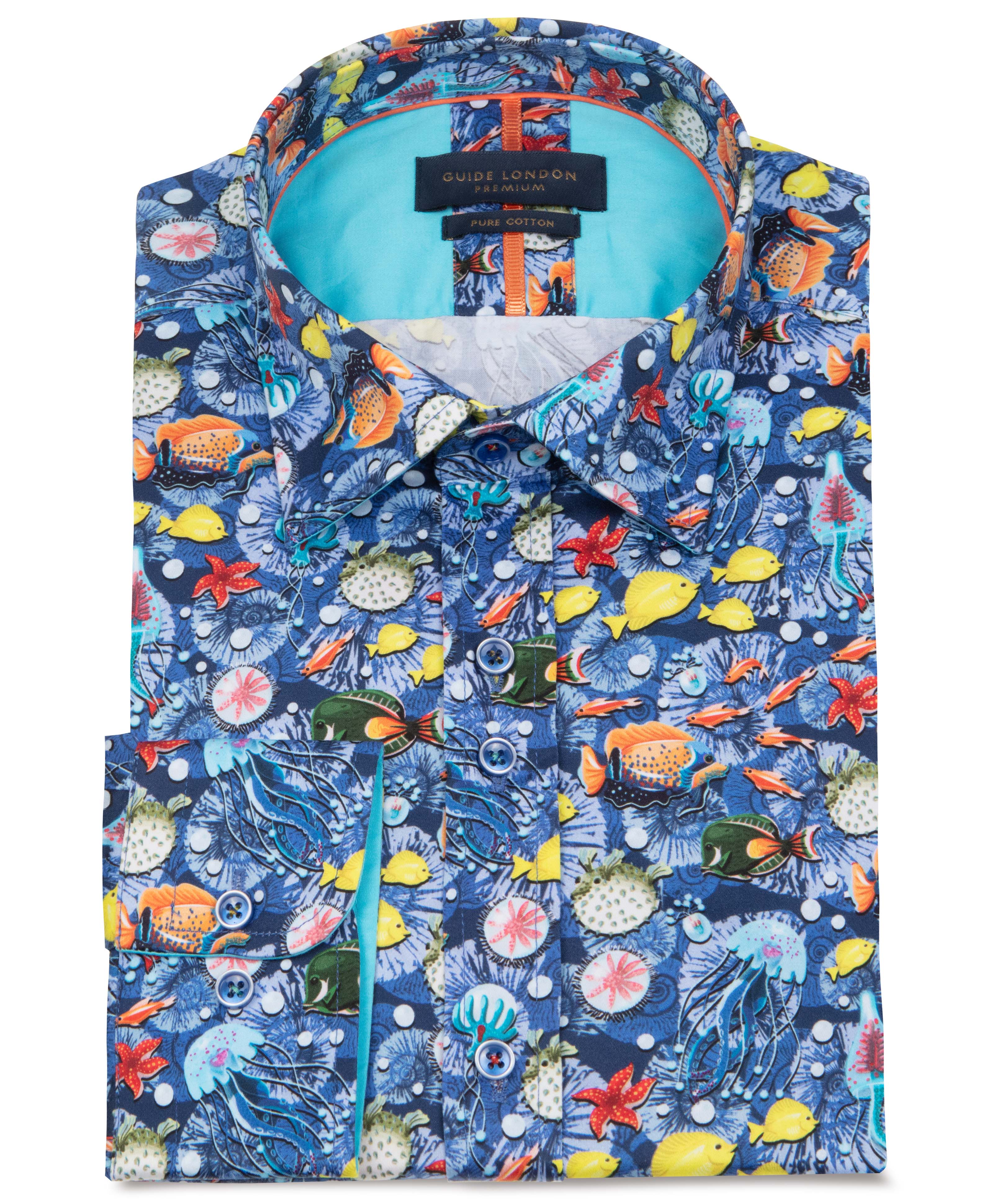 Embark on a tropical journey with our vibrant Fish Print Shirt, radiating bright, playful vibes. Featuring a myriad of colors reminiscent of a rainbow, this shirt exudes endless fun and excitement. Crafted from our signature soft-touch pure cotton sateen fabric, it ensures both style and comfort. Dive into the joy of tropical fashion with this lively and energetic piece.