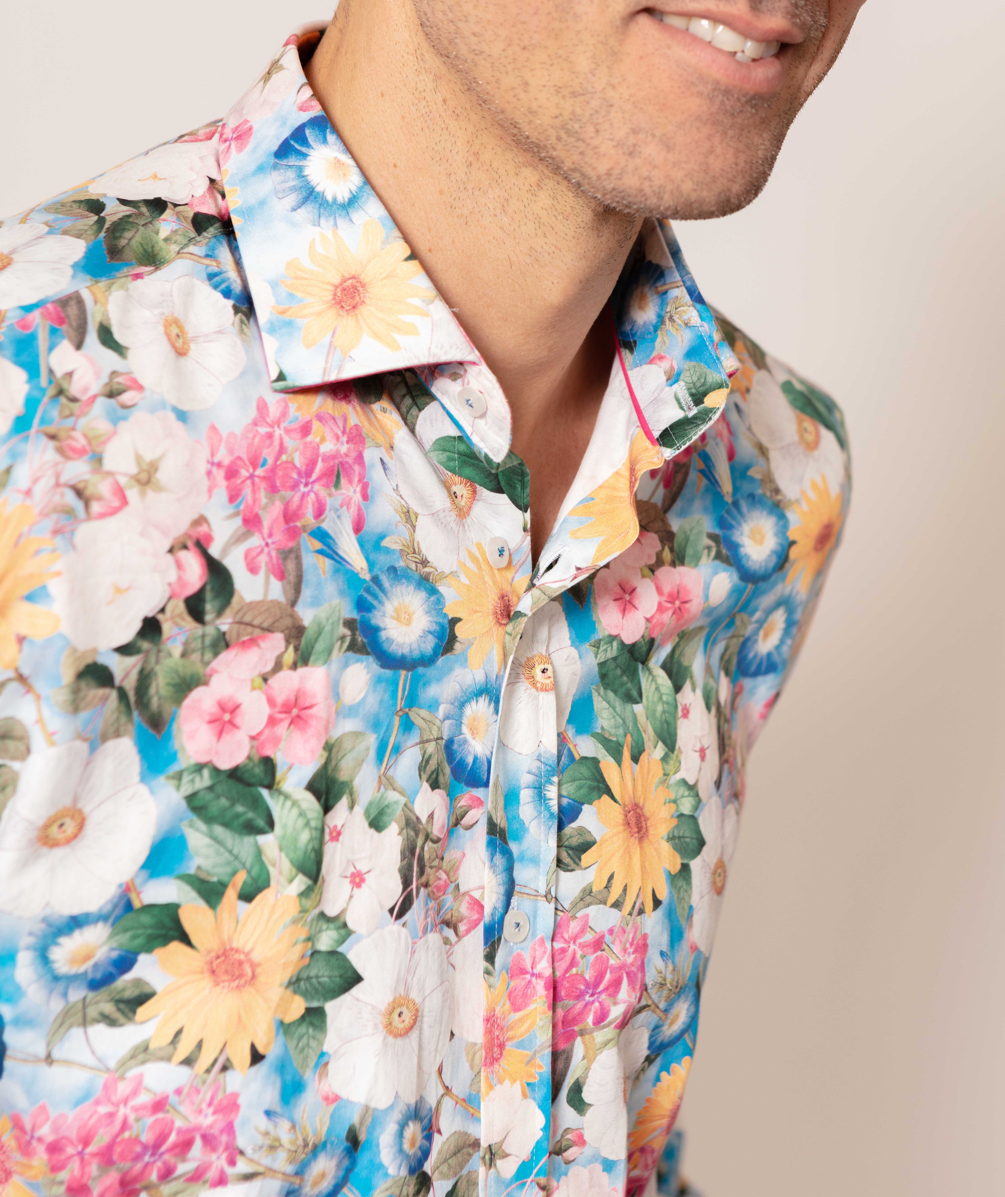 Elevate your style effortlessly with our Men's Long Sleeve Cotton Shirt. Impeccably crafted from premium cotton with a luxurious sateen finish, this shirt boasts a vibrant flower print in bold, eye-catching colours. Stay cool and comfortable throughout the day while making a colourful statement in your wardrobe. Perfect for the modern fashion enthusiast who seeks both style and comfort.