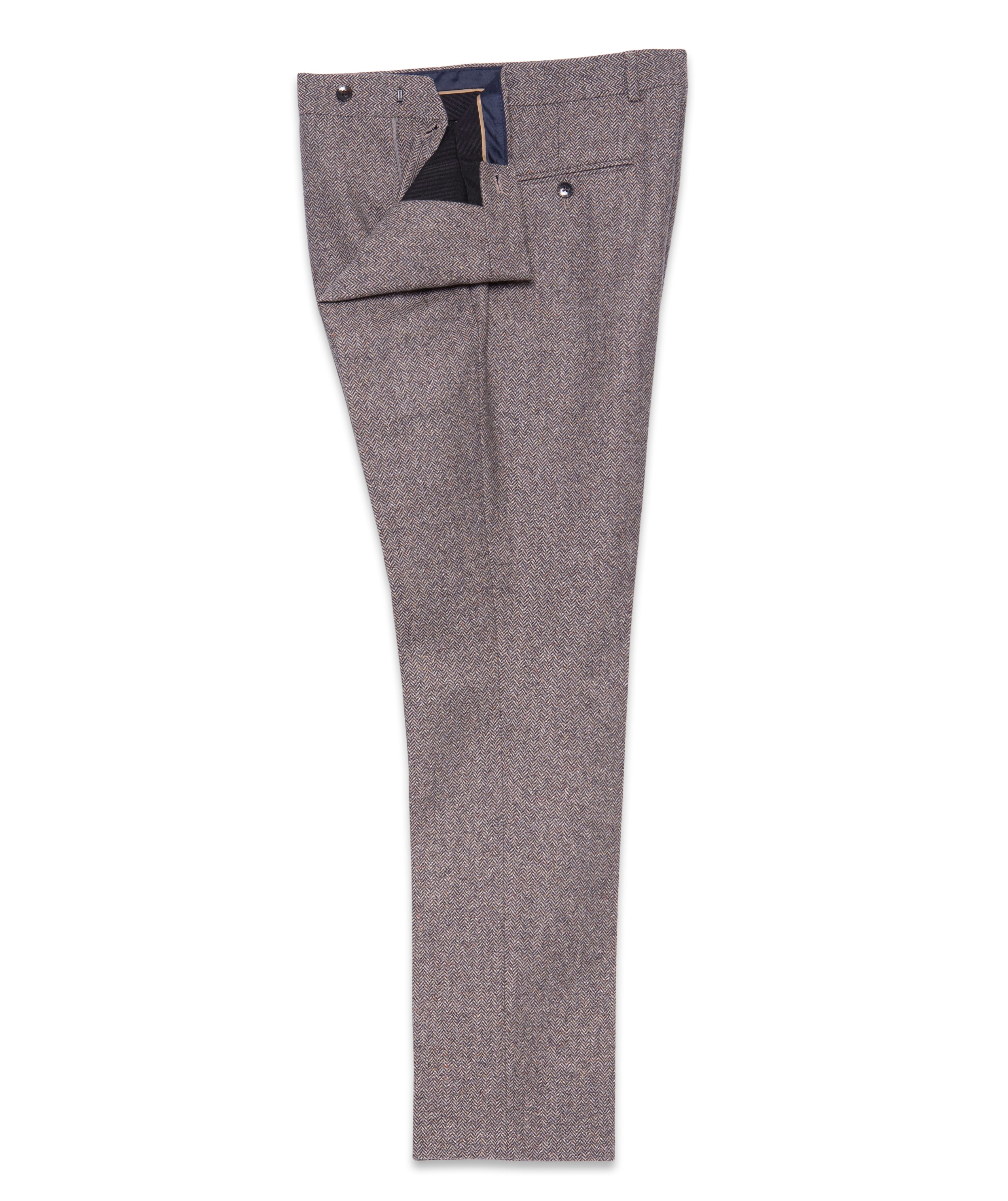 Elevate your wardrobe with our wool blend herringbone trousers, offering a perfect balance of style and comfort. Crafted from a luxurious wool blend, these trousers feature rich brown tones with subtle hints of pink, adding a unique and sophisticated twist to a timeless design. The tailored fit provides a sleek and refined silhouette, making them versatile enough for both formal events and smart-casual settings.